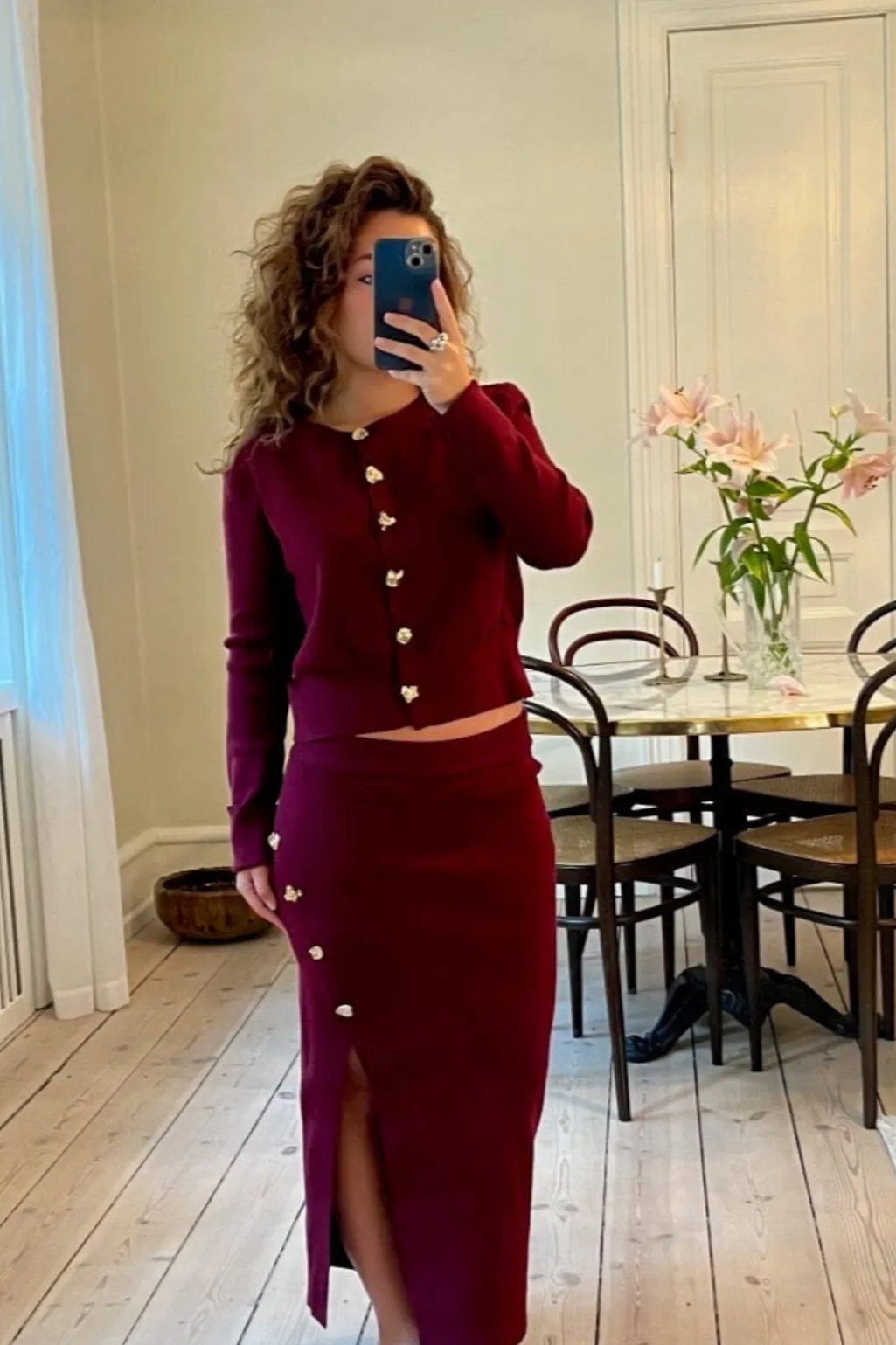 Bordeaux cardigan fra A-bee med slim fit og dekorative guldfarvede knapper i forskellige former. Cardiganen har lange ærmer og en rund halsudskæring.