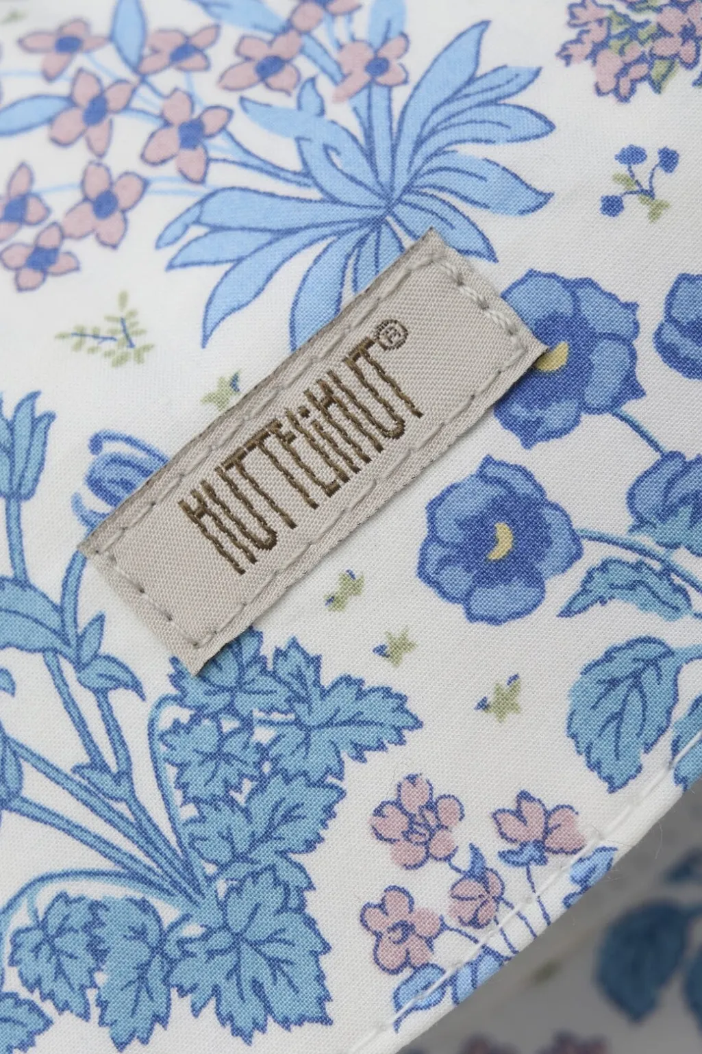 Sommerhat fra Huttelihut med UV-beskyttelse og nakkeskærm. Hatten er lavet i Liberty-stof med et blomstermønster i blå nuancer og har en let, åndbar konstruktion.