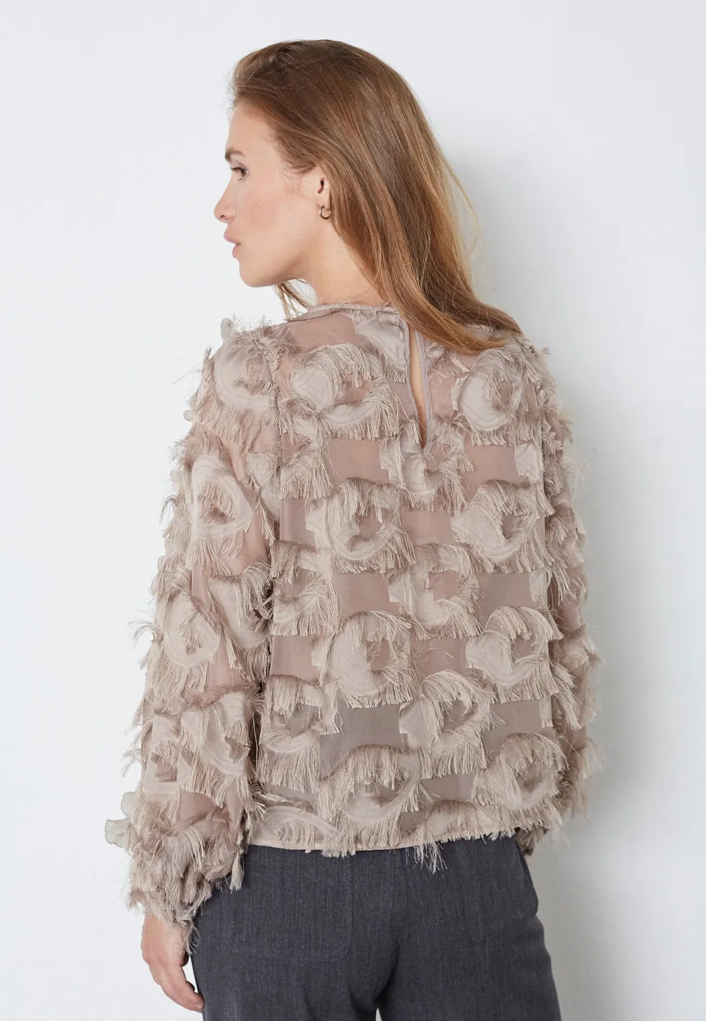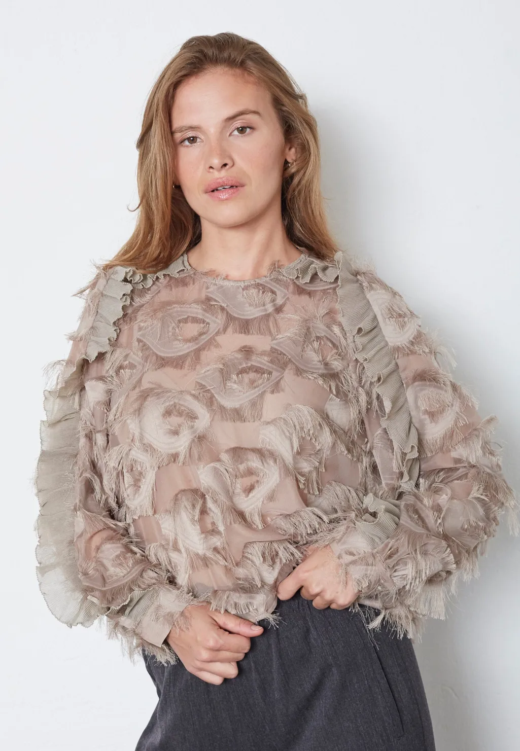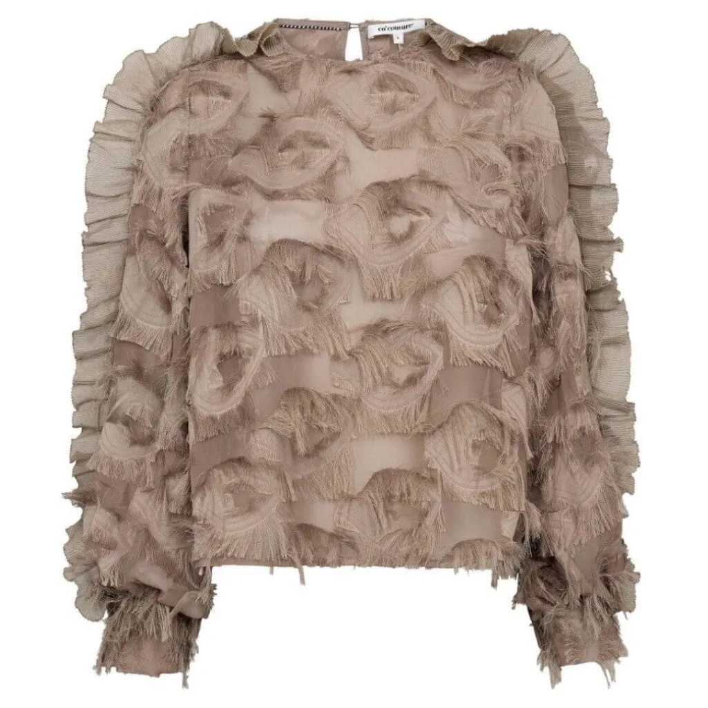Brun bluse fra Co’Couture i valnødfarvet polyester. Blusen har en struktureret overflade med lag af ruflede detaljer og lange ærmer med rund halsudskæring.