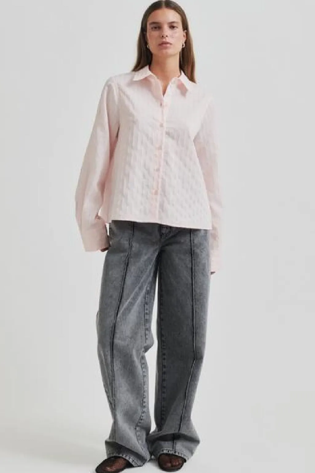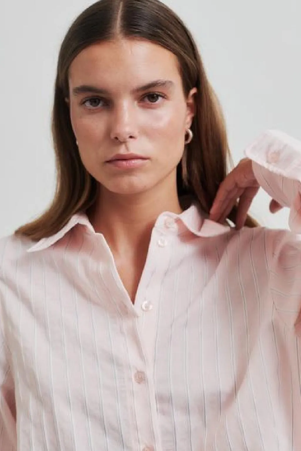 Stribet skjorte fra Second Female i lyserød med blå striber. Skjorten har klassisk krave, knapper foran og lange ærmer med manchetter.
