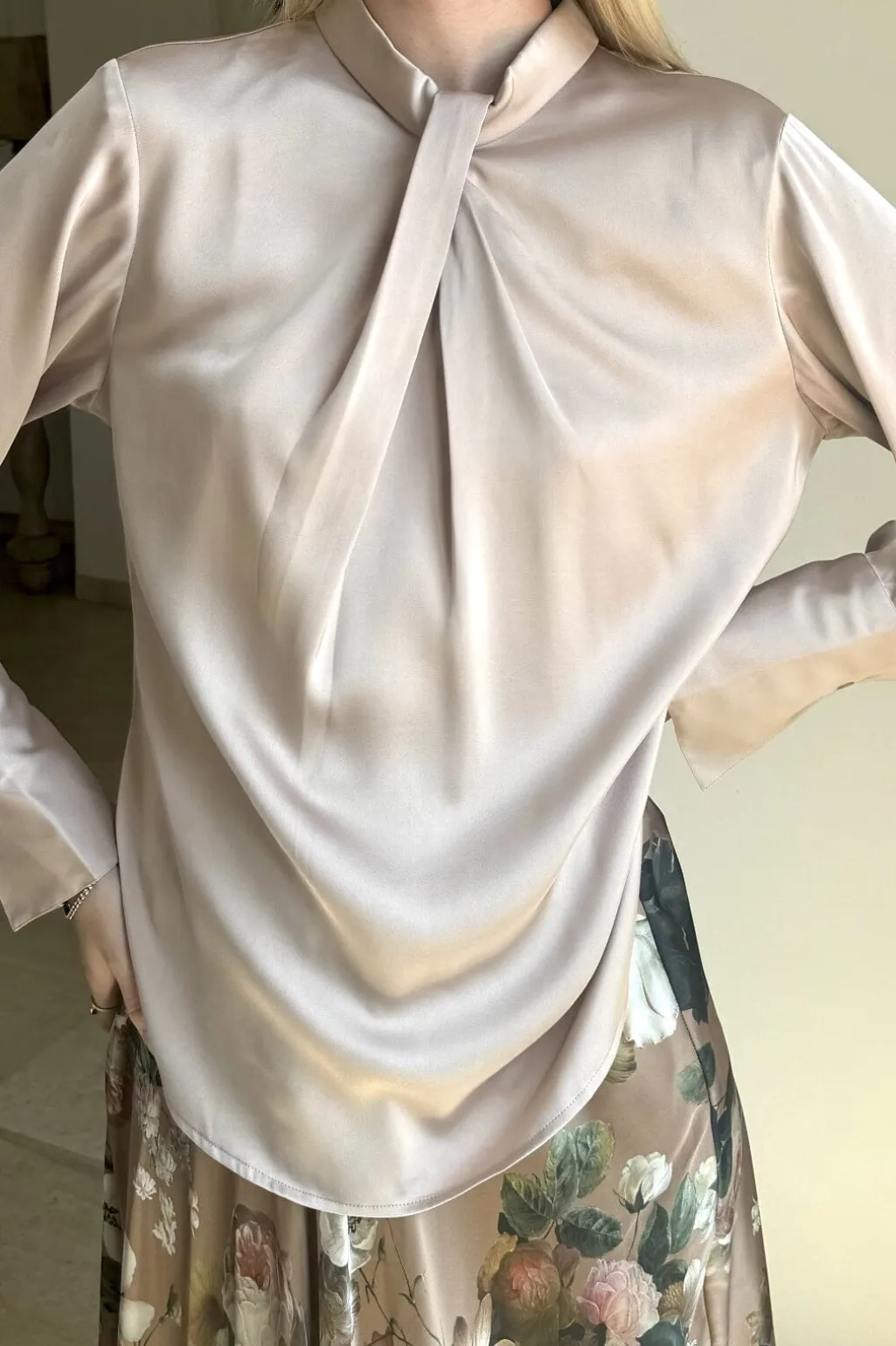 Cremehvid bluse fra Karmamia med høj krave og plisseret detalje foran. Blusen har en skinnende overflade og lange ærmer med brede manchetter.