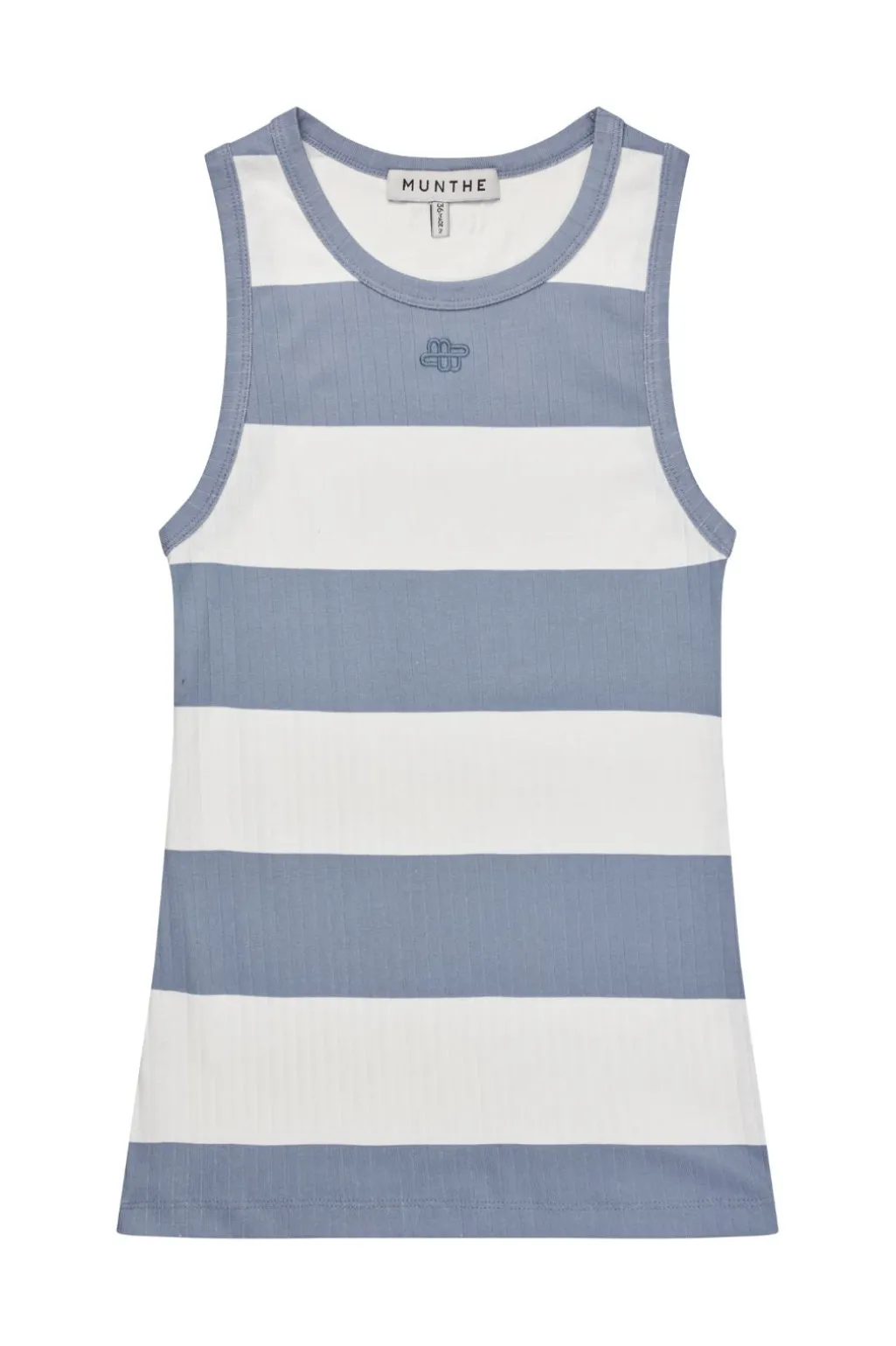 Ærmeløs top fra Munthe med vandrette striber i blå og hvid. Toppen har et lille, broderet Munthe-logo på brystet.