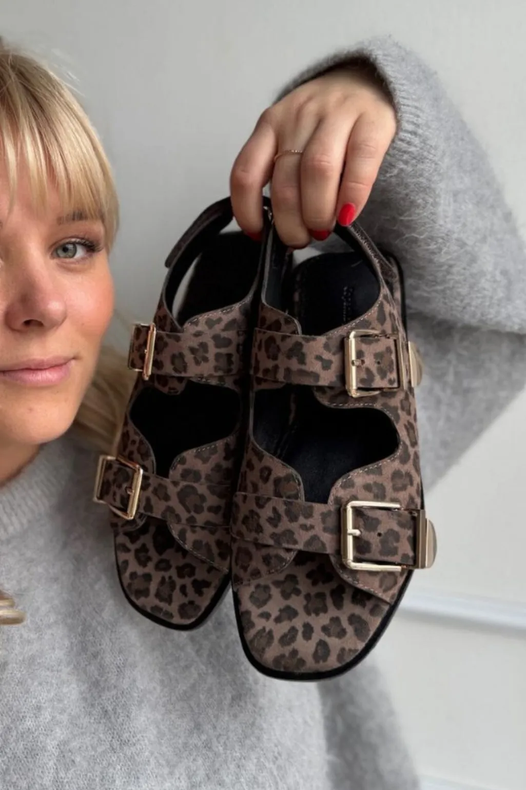 Sandaler fra Copenhagen Shoes i ruskind med leopardprint. Den brune taupe farve og det karakteristiske mønster giver sandalerne et særegent udseende.