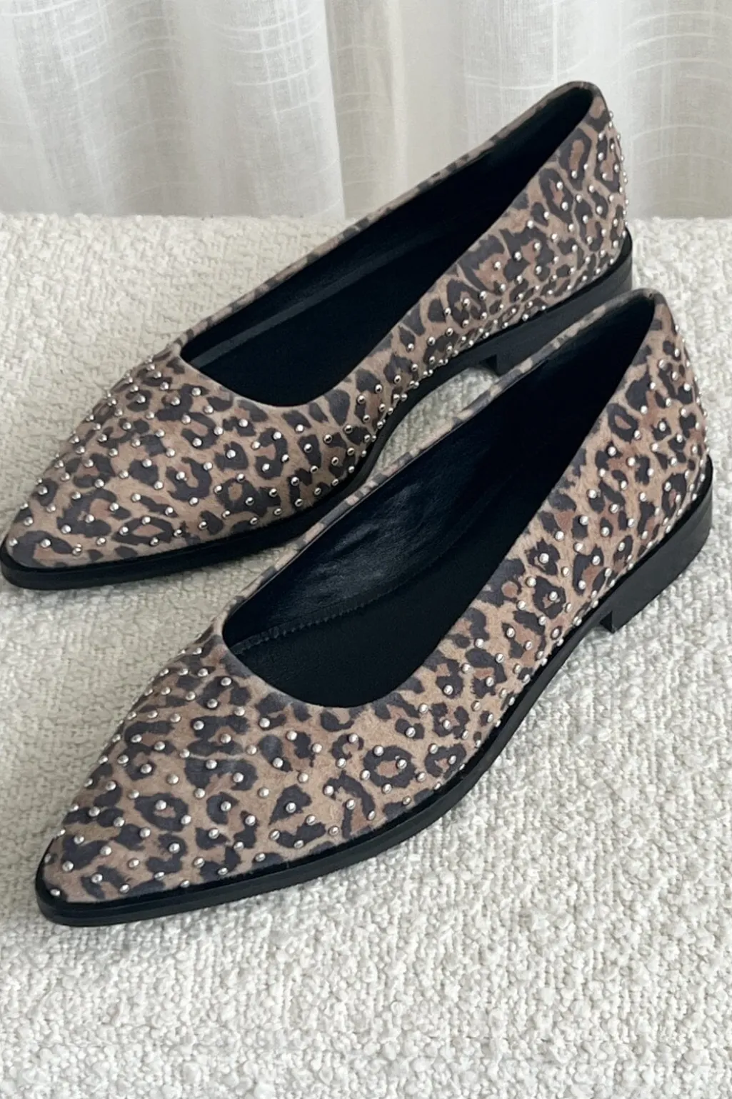 Ballerina i ruskind fra Copenhagen Shoes med beige og sort leopardmønster. Skoen har en spids tå og er pyntet med perledetaljer over hele overfladen.