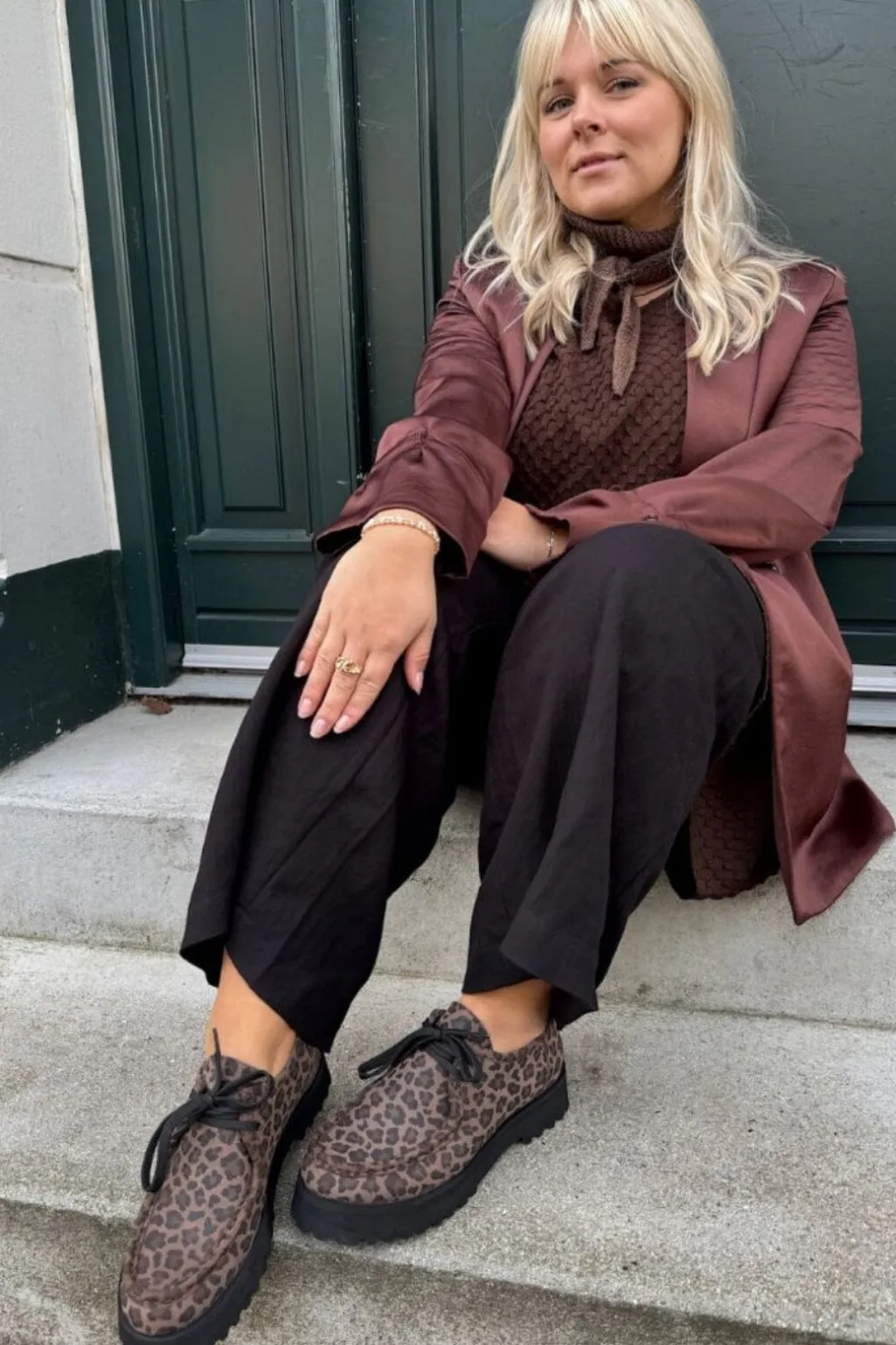 Sneakers fra Copenhagen Shoes i ruskind med brunt leopardmønster. Skoene har sorte snørebånd og en sort EVA-sål med god fleksibilitet.