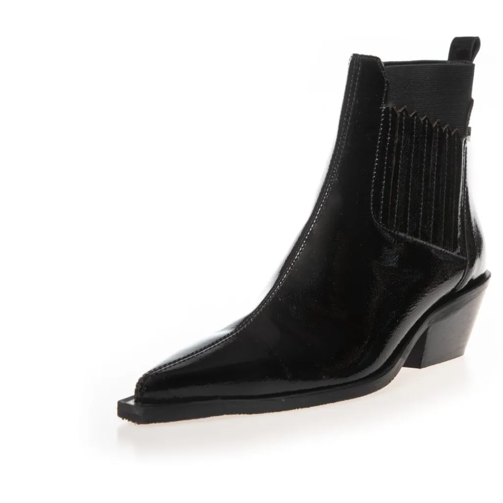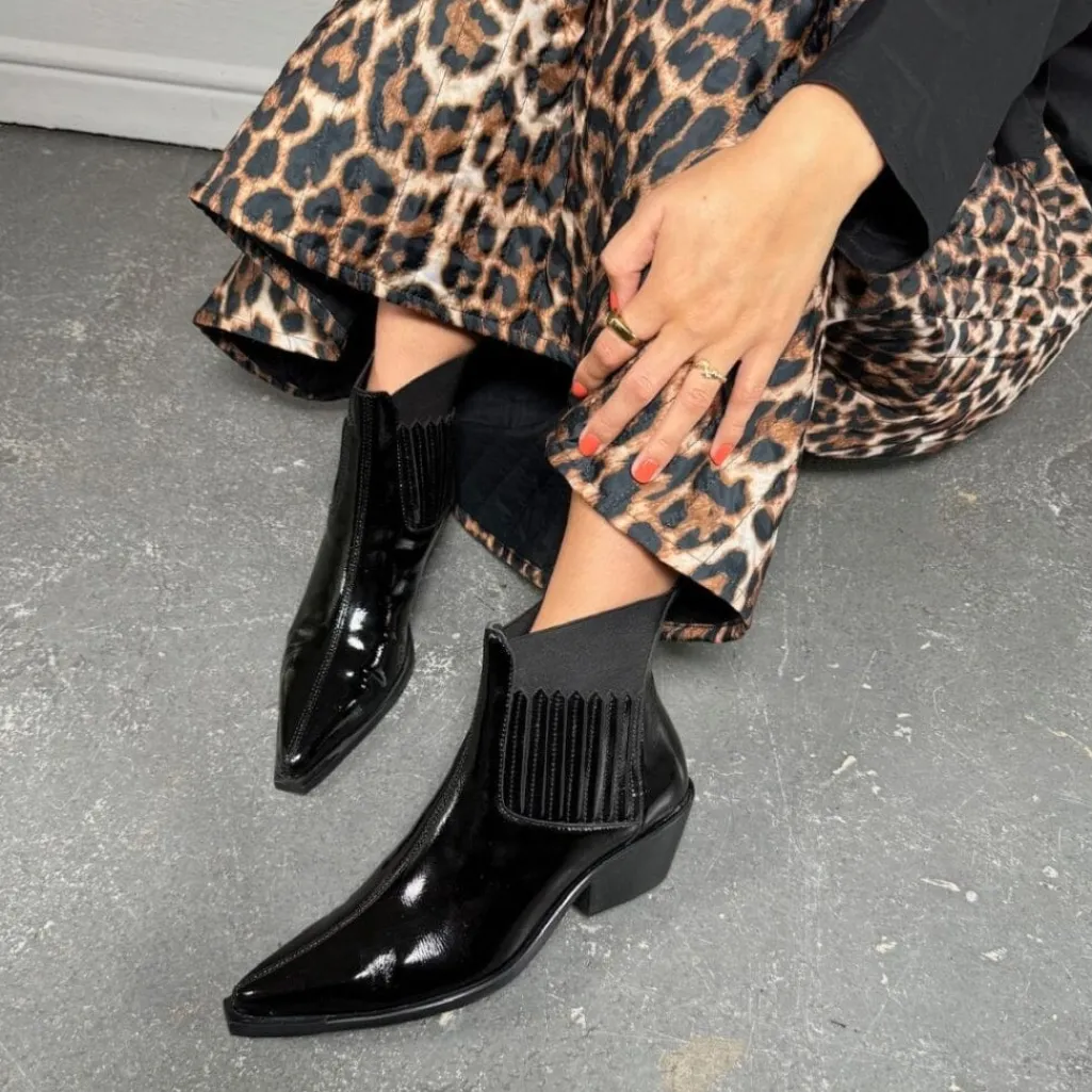 Sort ankelstøvle fra Copenhagen Shoes med blank patentoverflade. Støvlen har en spids tå og en lav blokhæl, der gør den stabil at gå i.