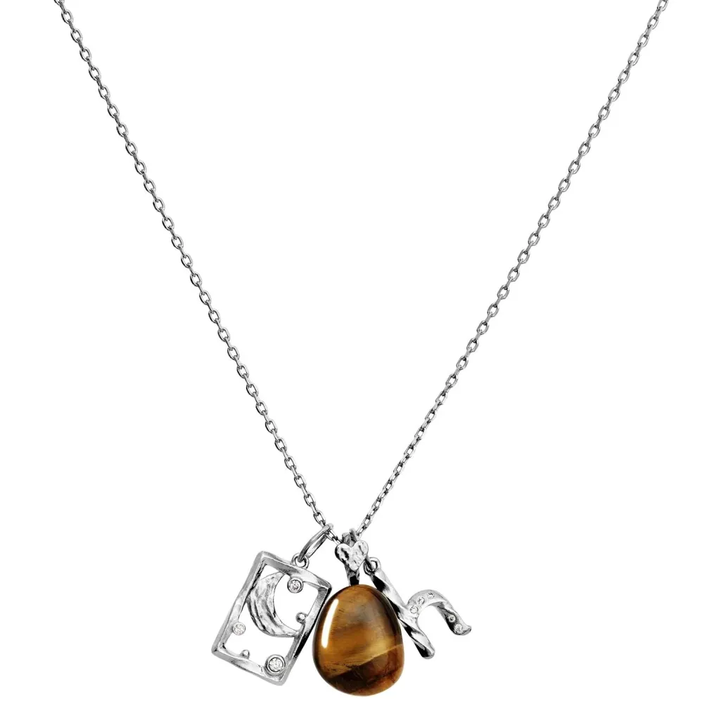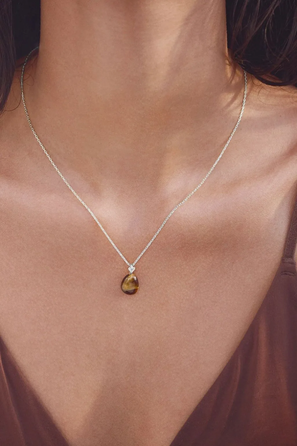Vedhæng fra Maanesten med en dråbeformet tigerøje-sten i guld og brune nuancer. Stenen har et stribet mønster og en glat overflade. Vedhænget har et hjerteformet ophæng.
