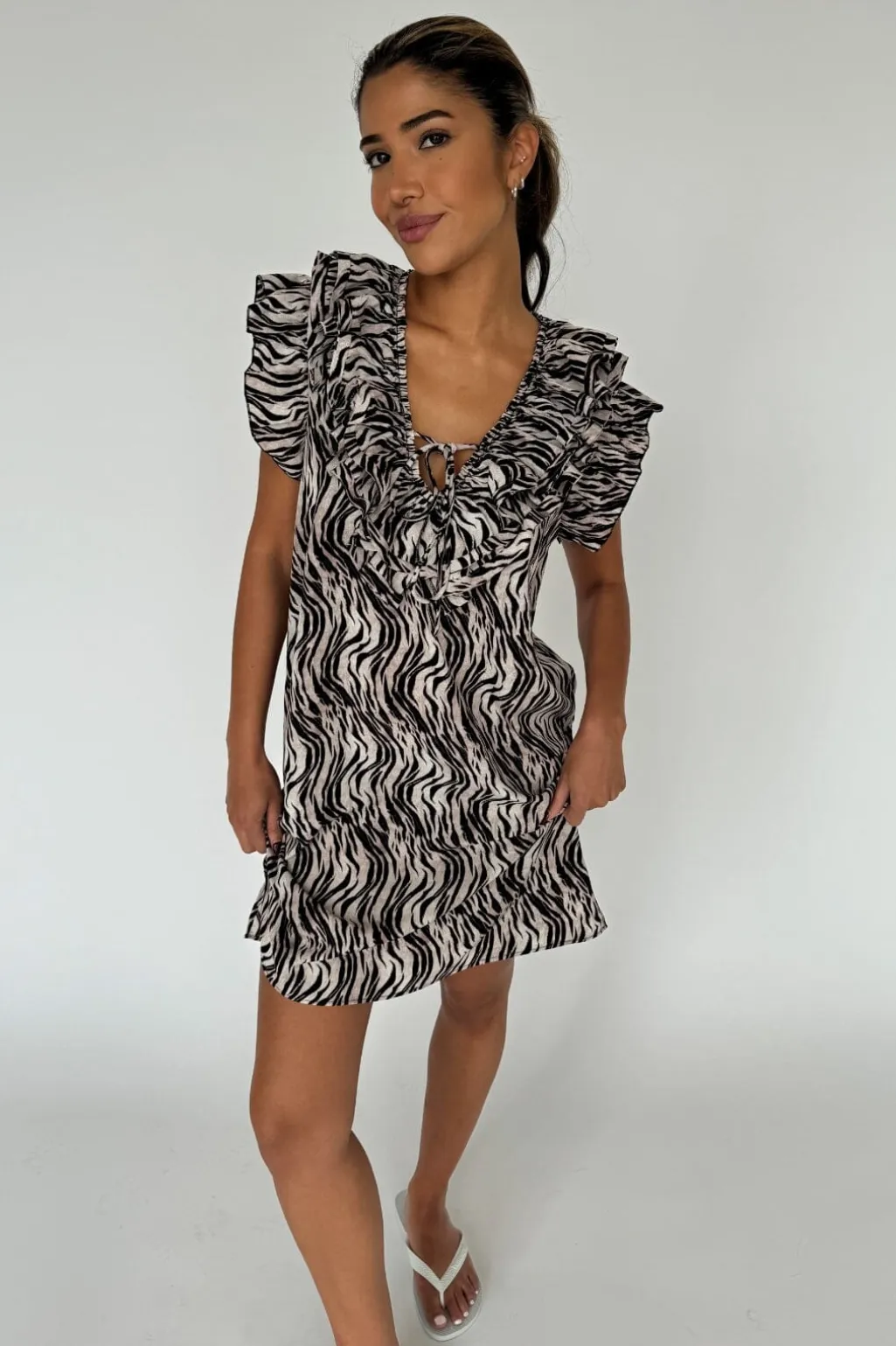 Kort kjole fra Continue i sort-hvidt zebramønster. Kjolen har flæseærmer og en dyb V-udskæring, der giver den et særligt design.