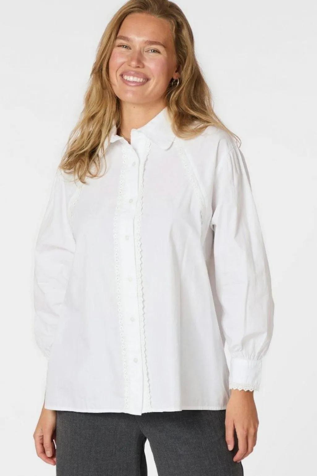 Hvid poplinskjorte fra Neo Noir med pufærmer og blondedetaljer. Skjorten har en skjortekrave og knaplukning med dekorative blondekanter langs fronten.