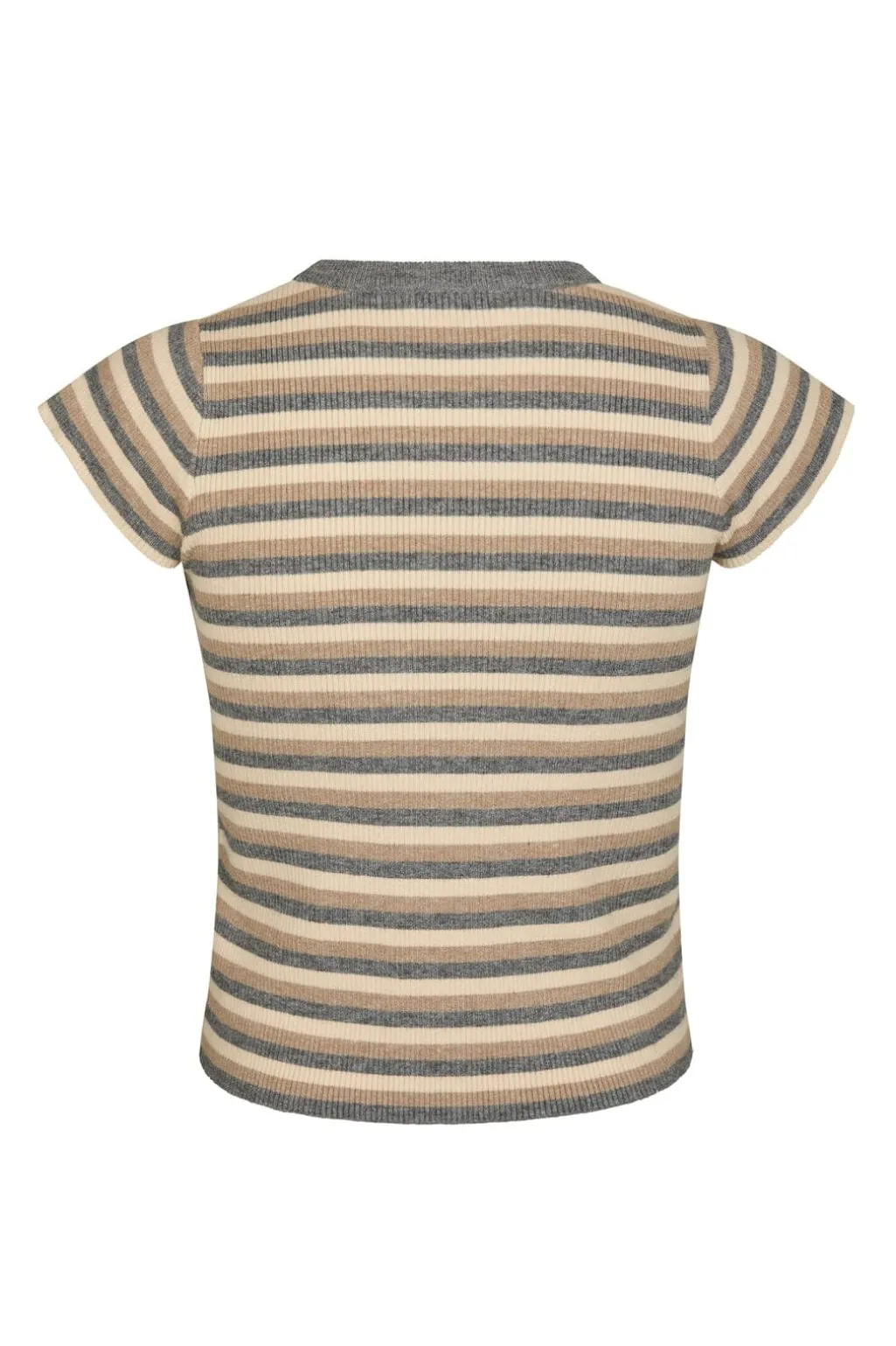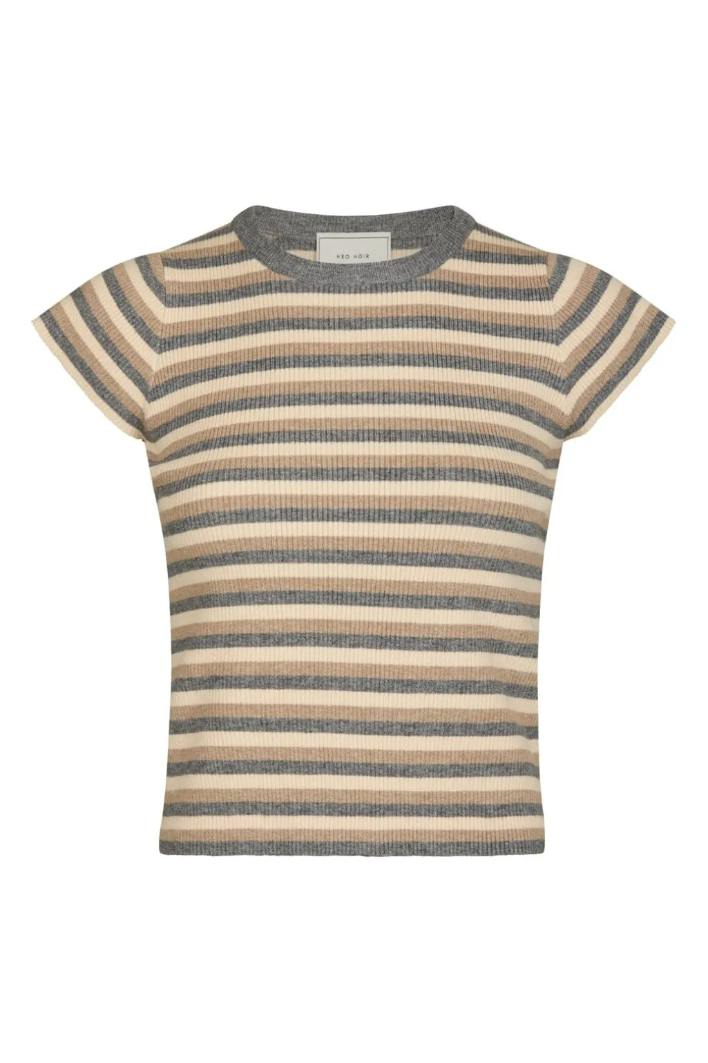 Stribet strikket top fra Neo Noir i grå og beige nuancer. Toppen har korte ærmer, en tætsiddende pasform og en rund halsudskæring.