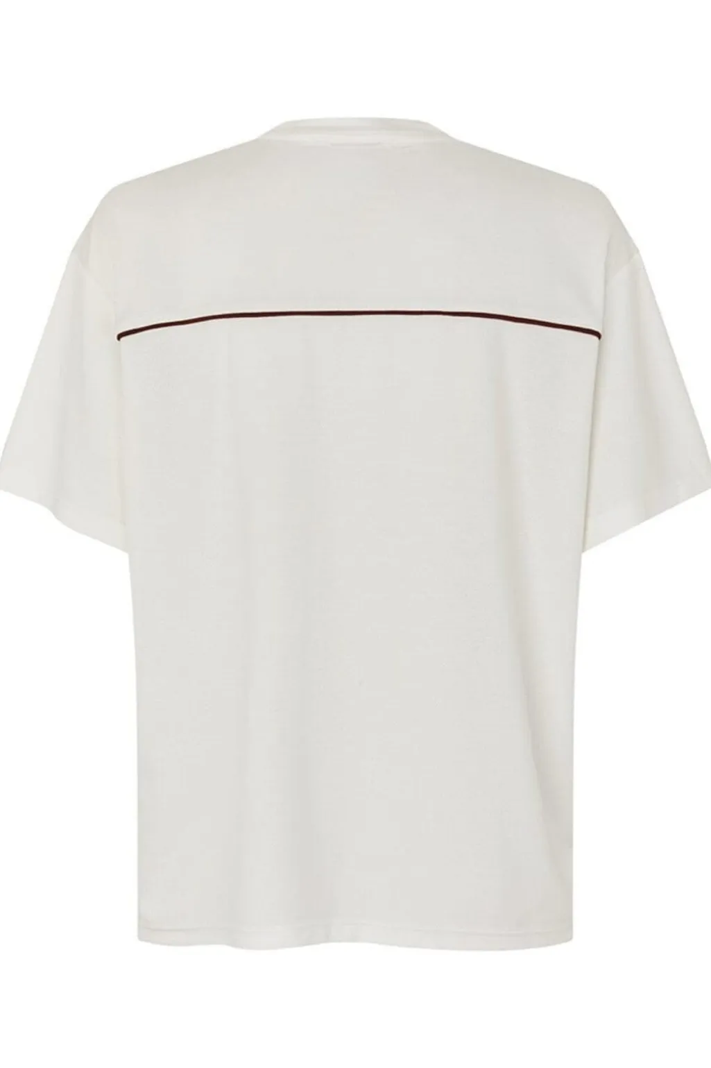 Cremehvid t-shirt fra Modström med sporty design. T-shirten har et stort 04-print på forsiden og bordeauxfarvede pipingdetaljer ved skuldrene og ryggen.