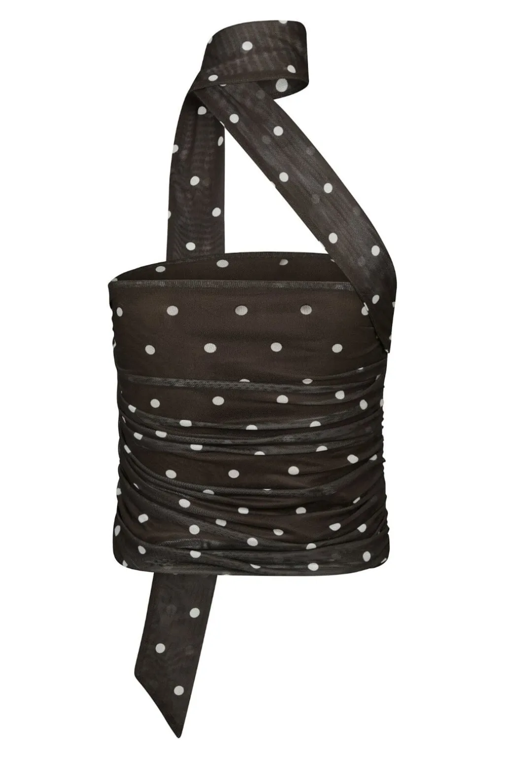 Brun mesh-top fra Neo Noir med hvide polkaprikker. Toppen har et off-shoulder-design med rynkedetaljer og bindedetalje ved halsen. Stoffet har en let og luftig kvalitet.