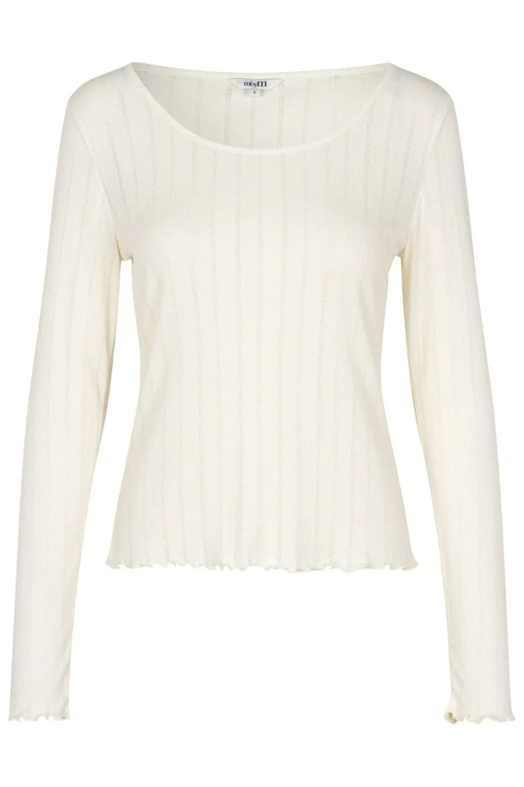 Langærmet top fra MbyM i økologisk bomuld. Toppen har en lys cremehvid farve og en løs pasform med ribbet tekstur samt frynsede kanter ved ærmerne og bunden.
