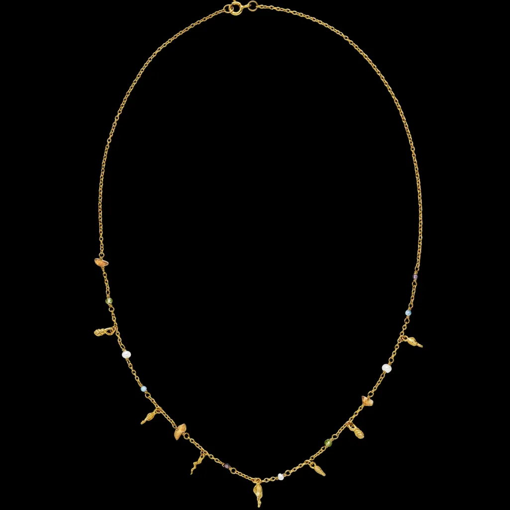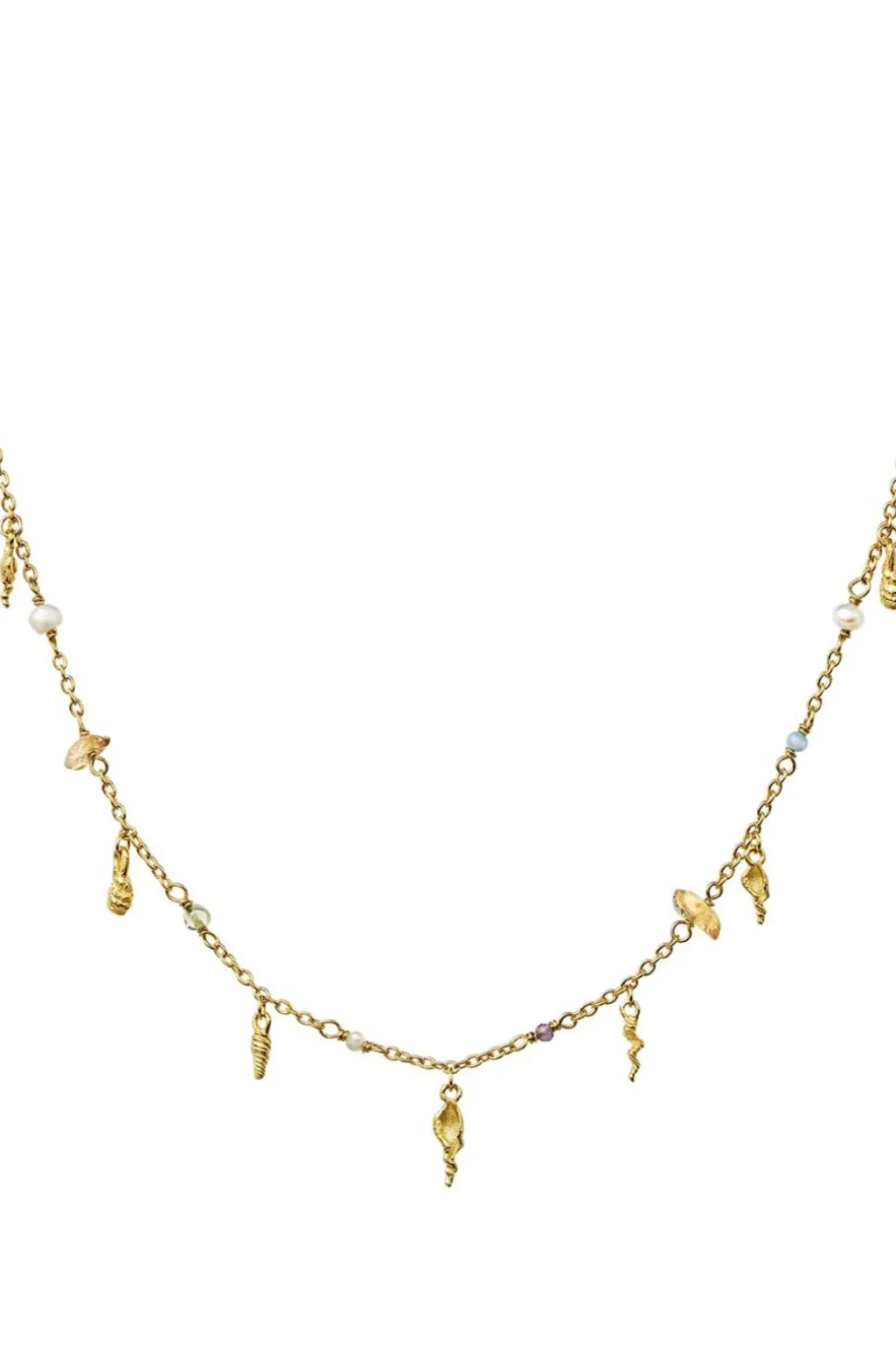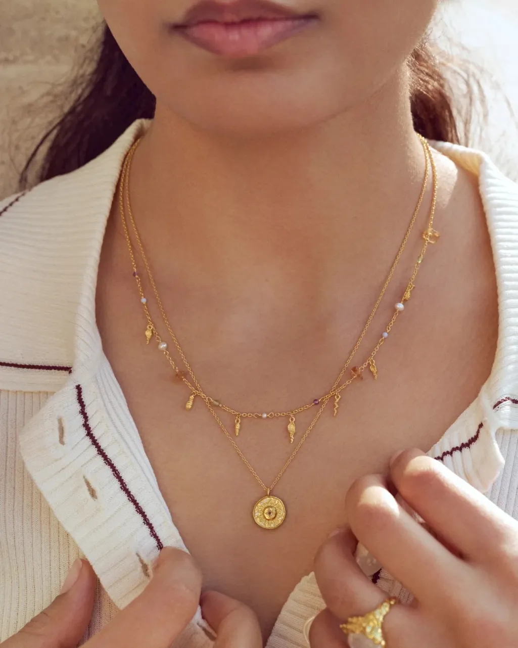 Guldbelagt halskæde fra Maanesten med citrin, opal, ametyst, prehnit og ferskvandsperler. De organiske vedhæng er lavet af genanvendt sterlingsølv med 18 karat guldbelægning.