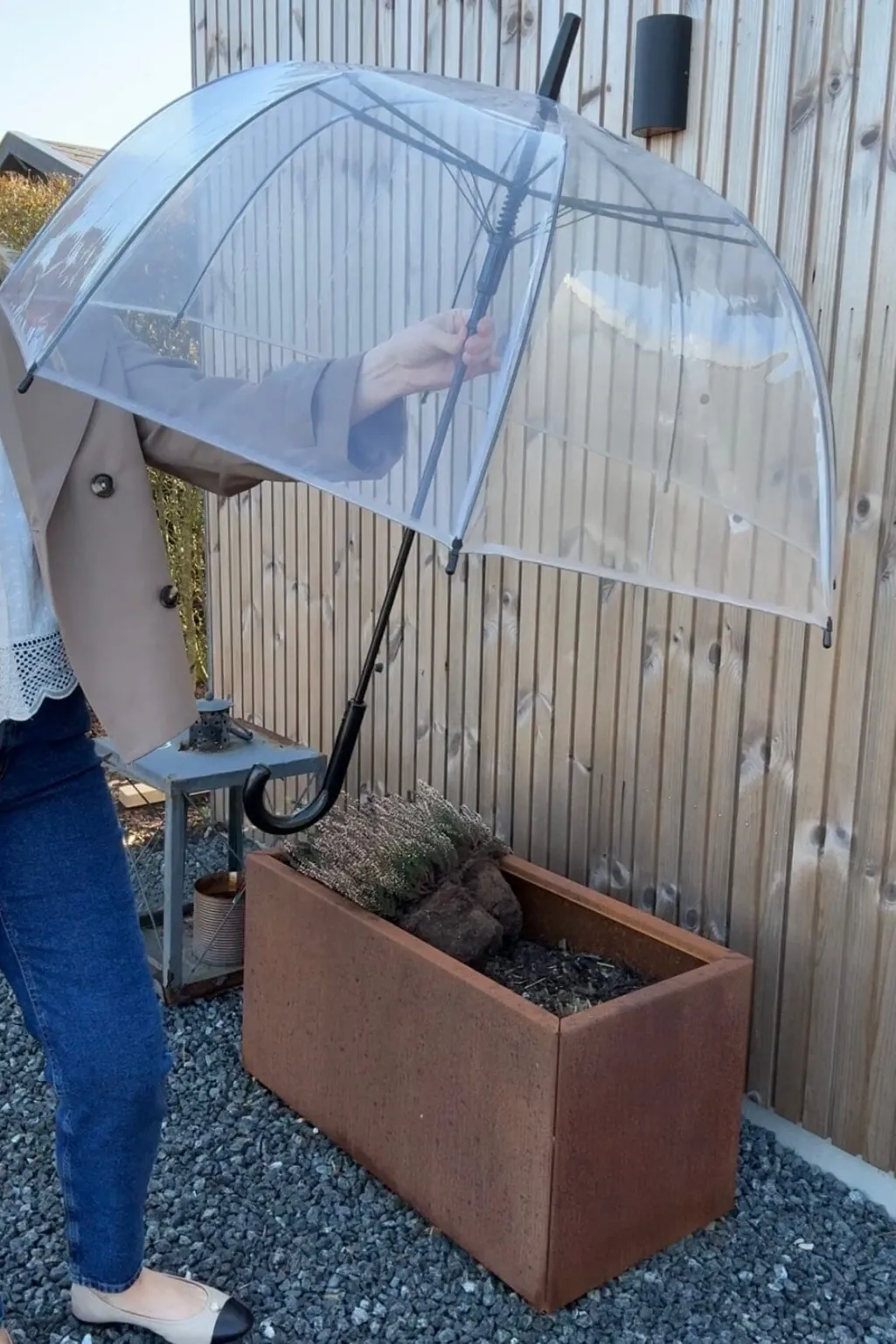 Transparent paraply med sort håndtag og detaljer. Den lette konstruktion gør den nem at have med i tasken, mens det gennemsigtige materiale sikrer godt udsyn i regnvejr.