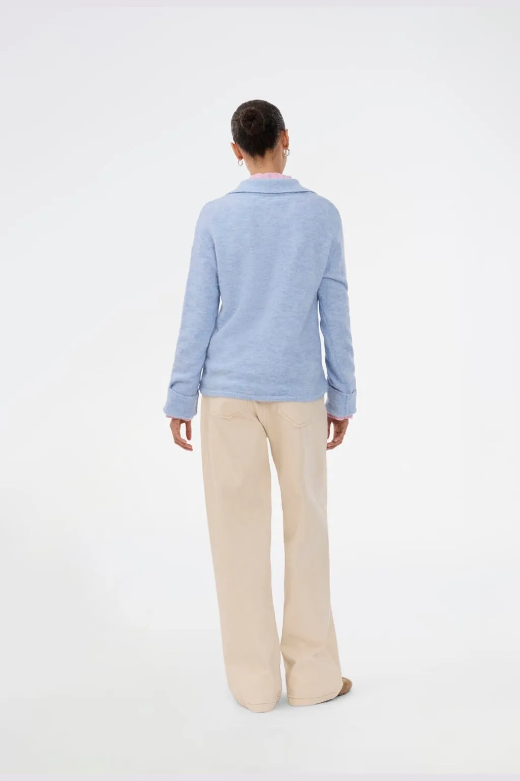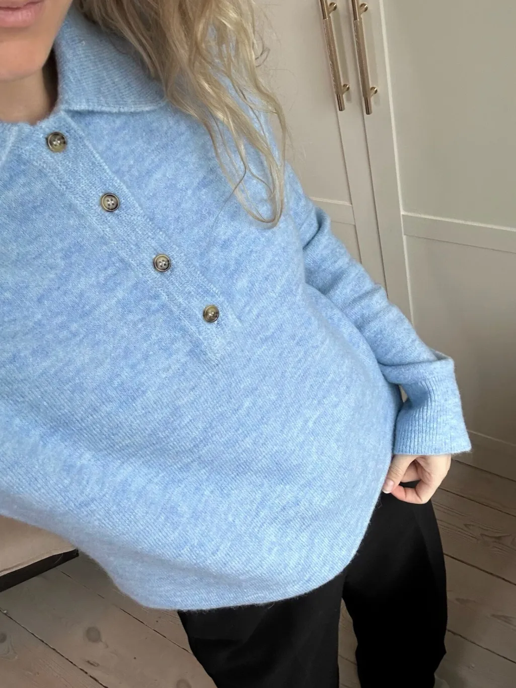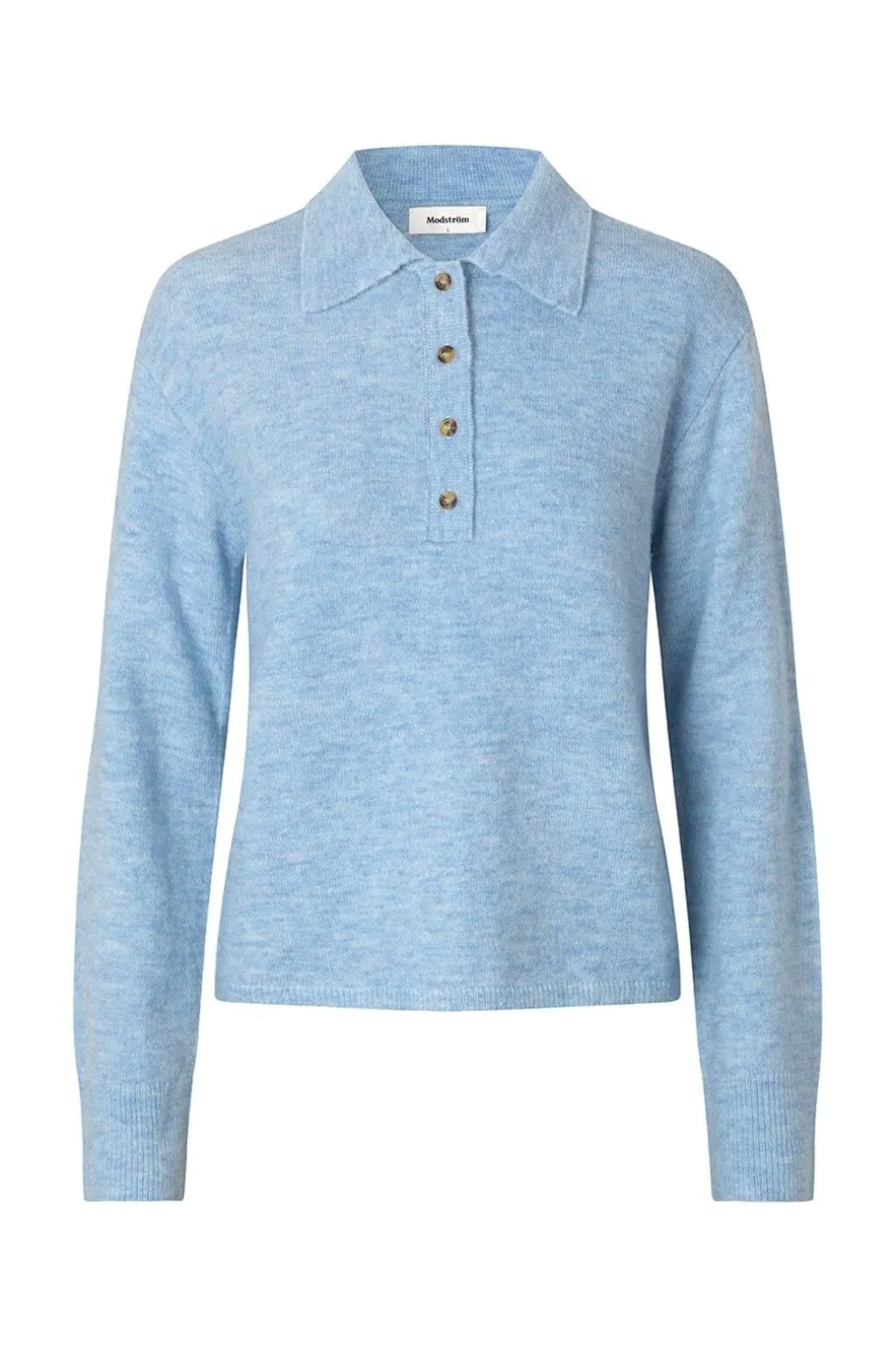 Strikket polo fra Modström i lyseblå. Den har en løs pasform med lange, brede ærmer og en klassisk polokrave med fire knapper foran.
