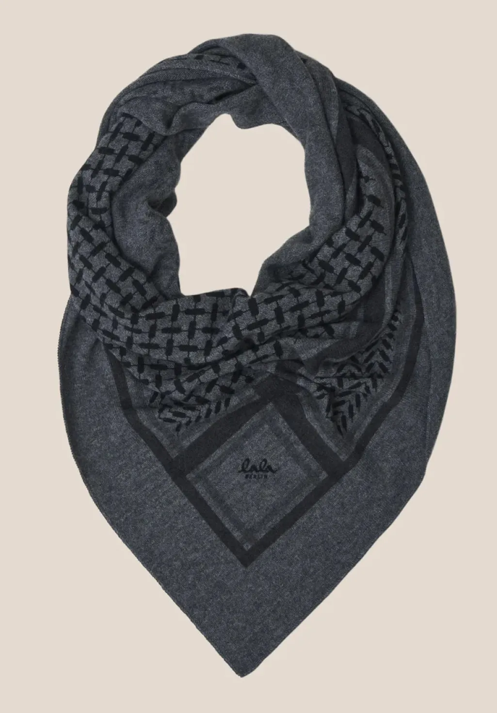 Trekantet tørklæde fra Lala Berlin i grå melange. Det grafiske Kufiya-print på den trekantede form gør tørklædet nemt at style på forskellige måder.