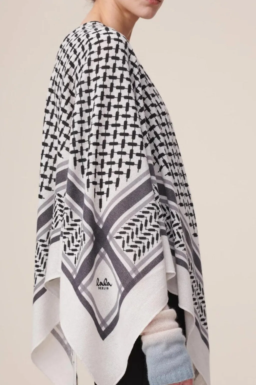 Trekantet tørklæde fra Lala Berlin i cremehvid med sort-hvidt ternet mønster. Det karakteristiske design har en klassisk form med geometriske detaljer langs kanten.