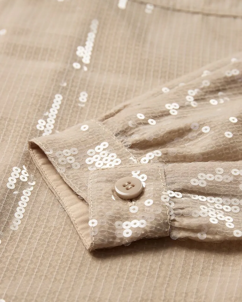 Truckerjakke fra Copenhagen Muse i varm sandfarve med pailletter. Jakken har skjortekrave, knaplukninger og to frontlommer.