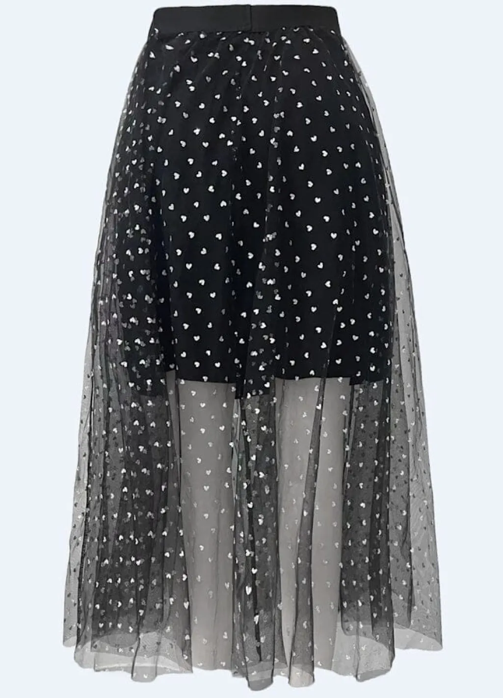Tylnederdel fra Liberte, lavet af sort tyl med små sølvhjerter. Nederdelen har et gennemsigtigt yderlag med en sort underkjole.