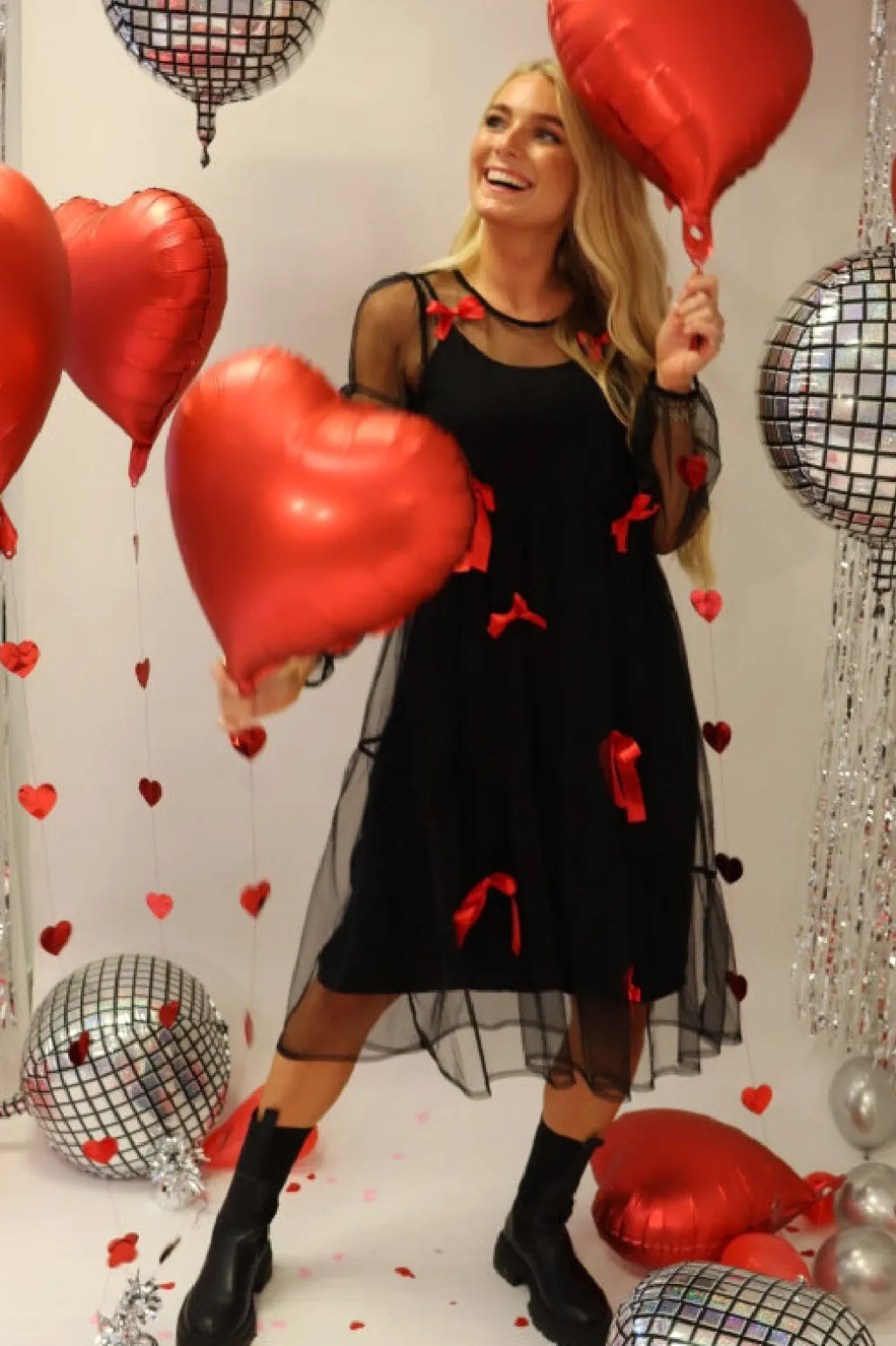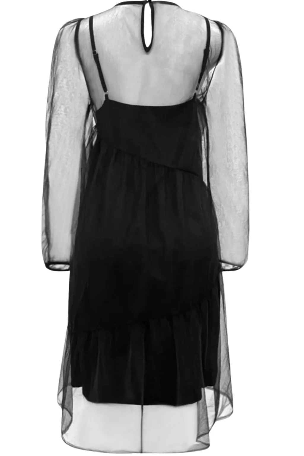 Sort knælang kjole fra Liberte med gennemsigtig tulle-overdel. De røde sløjfer på den sorte baggrund skaber en fin kontrast, og kjolen har lange ærmer.