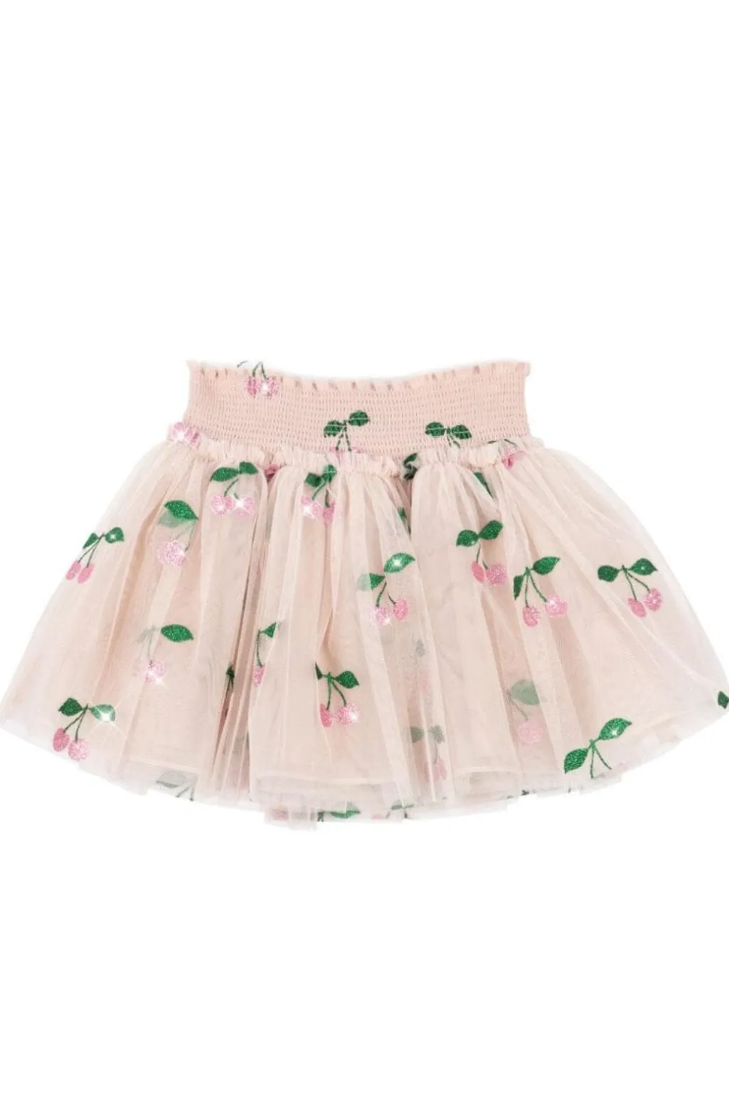 Nederdel fra Konges Sløjd i lyserød tyl med glitter. Dekoreret med broderede kirsebær i pink glitter og grønne blade.