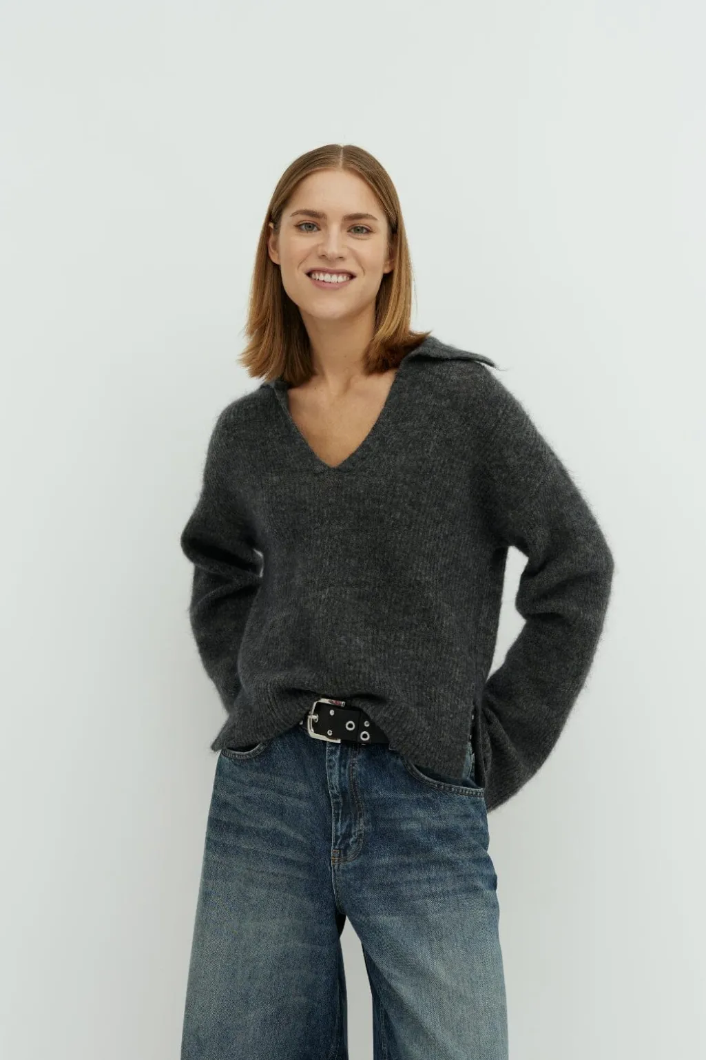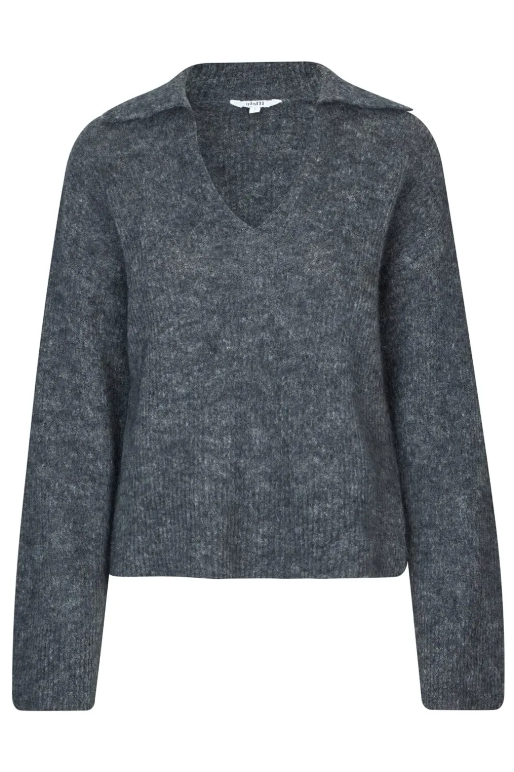 Grå striktrøje fra MbyM i meleret design med v-halsudskæring. Den har lange ærmer med ribkanter og en regular fit-pasform.