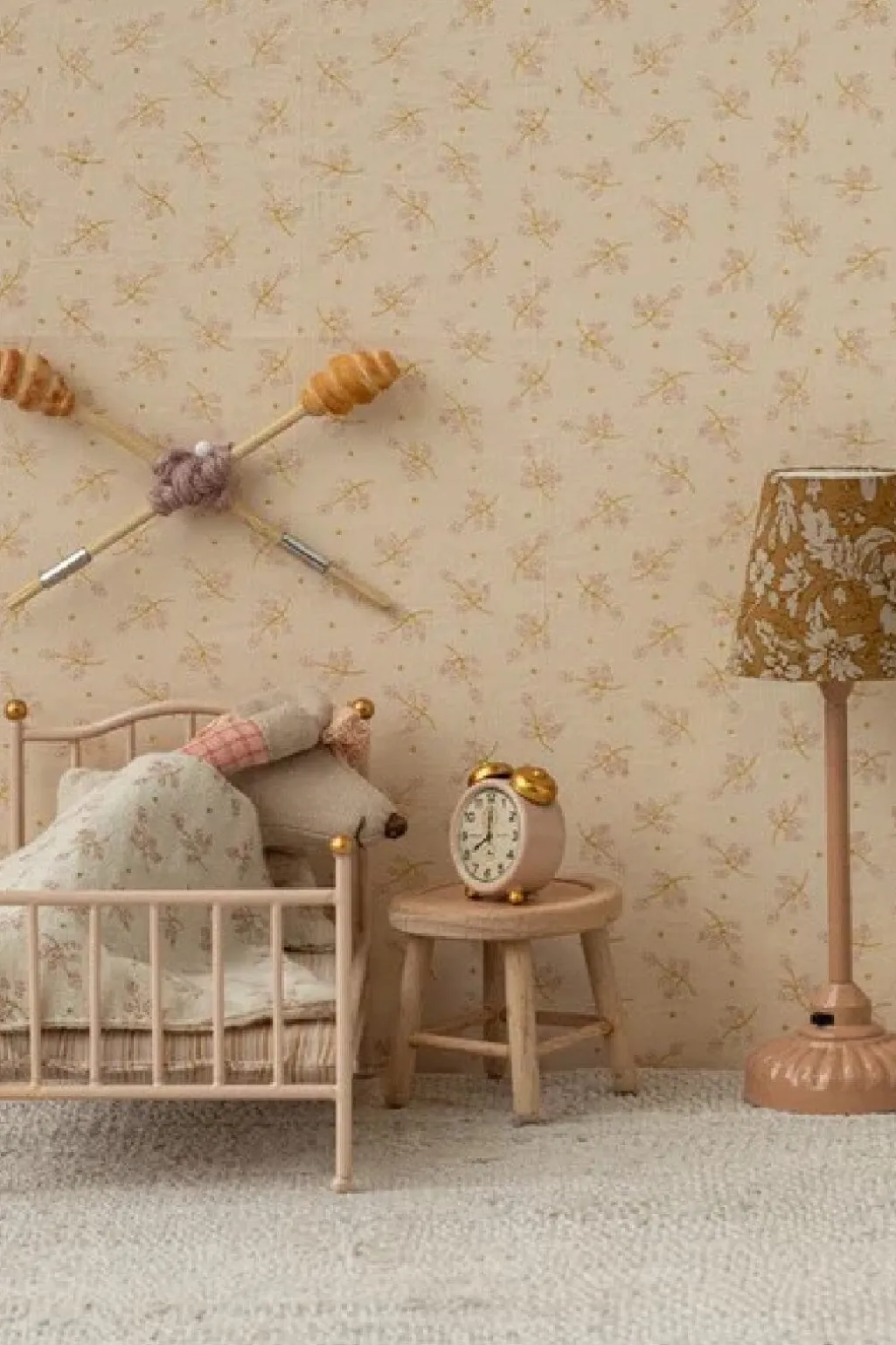 Et vækkeur fra Maileg i lyserød med gyldne detaljer. Uret har en klassisk form med to klokker på toppen og en tydelig urskive med tal og alarmfunktion.