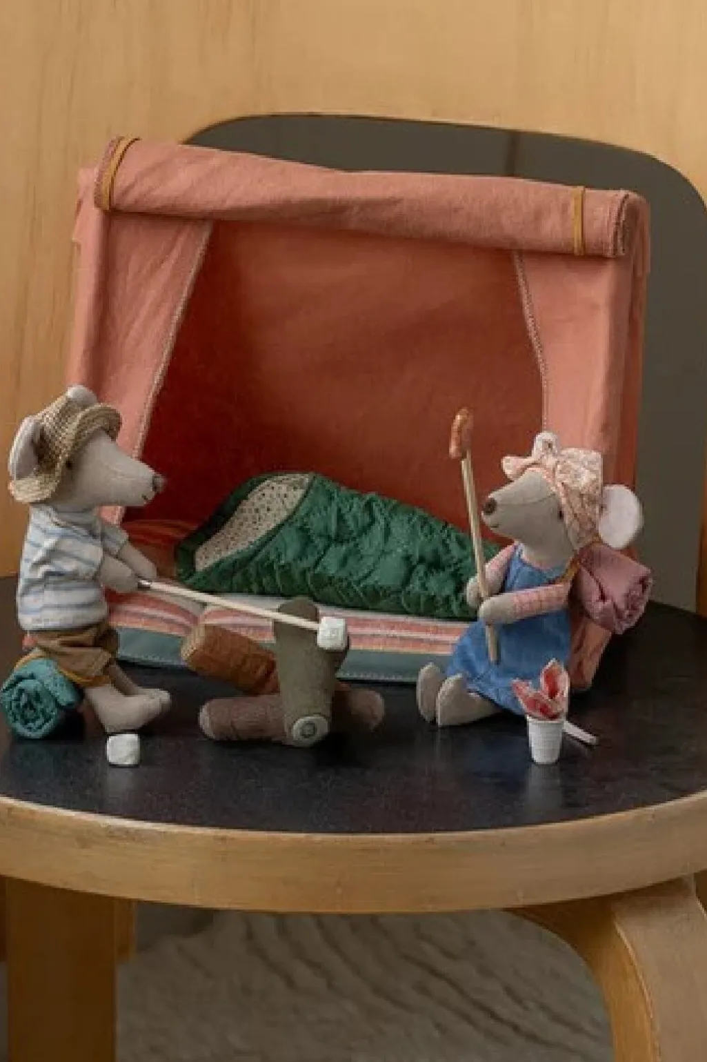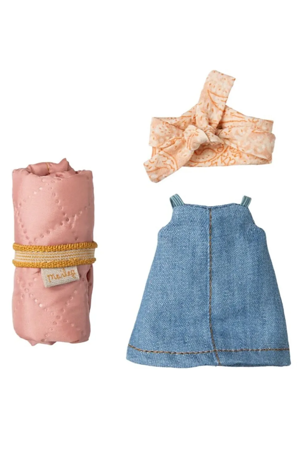 En musedukke fra Maileg med en blå kjole og en tilhørende sovepose. Musen har magneter i hænderne, der gør det muligt at placere den i forskellige stillinger under leg.