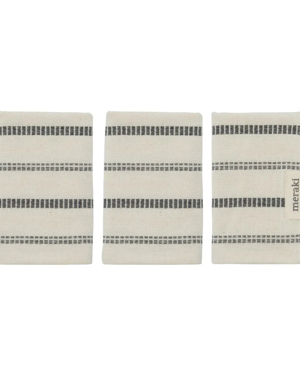 Vaskeklud fra Meraki i råhvid med sorte striber. Fremstillet i OEKO-TEX-certificeret bomuld, fri for skadelige stoffer. Striberne giver et kontrastfuldt look til køkkenet.