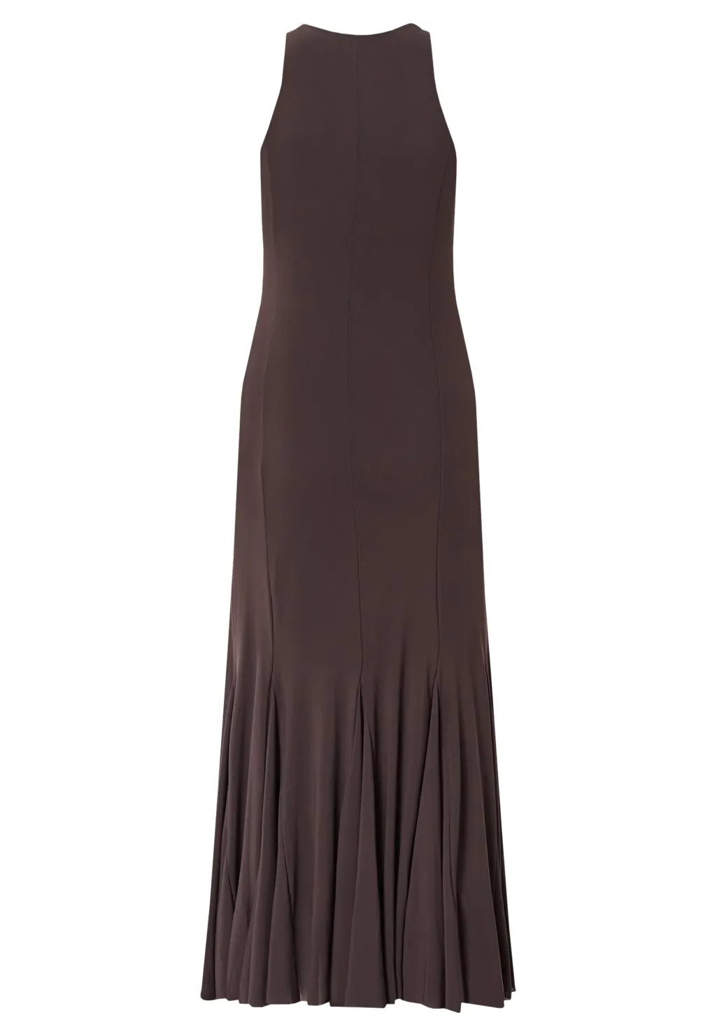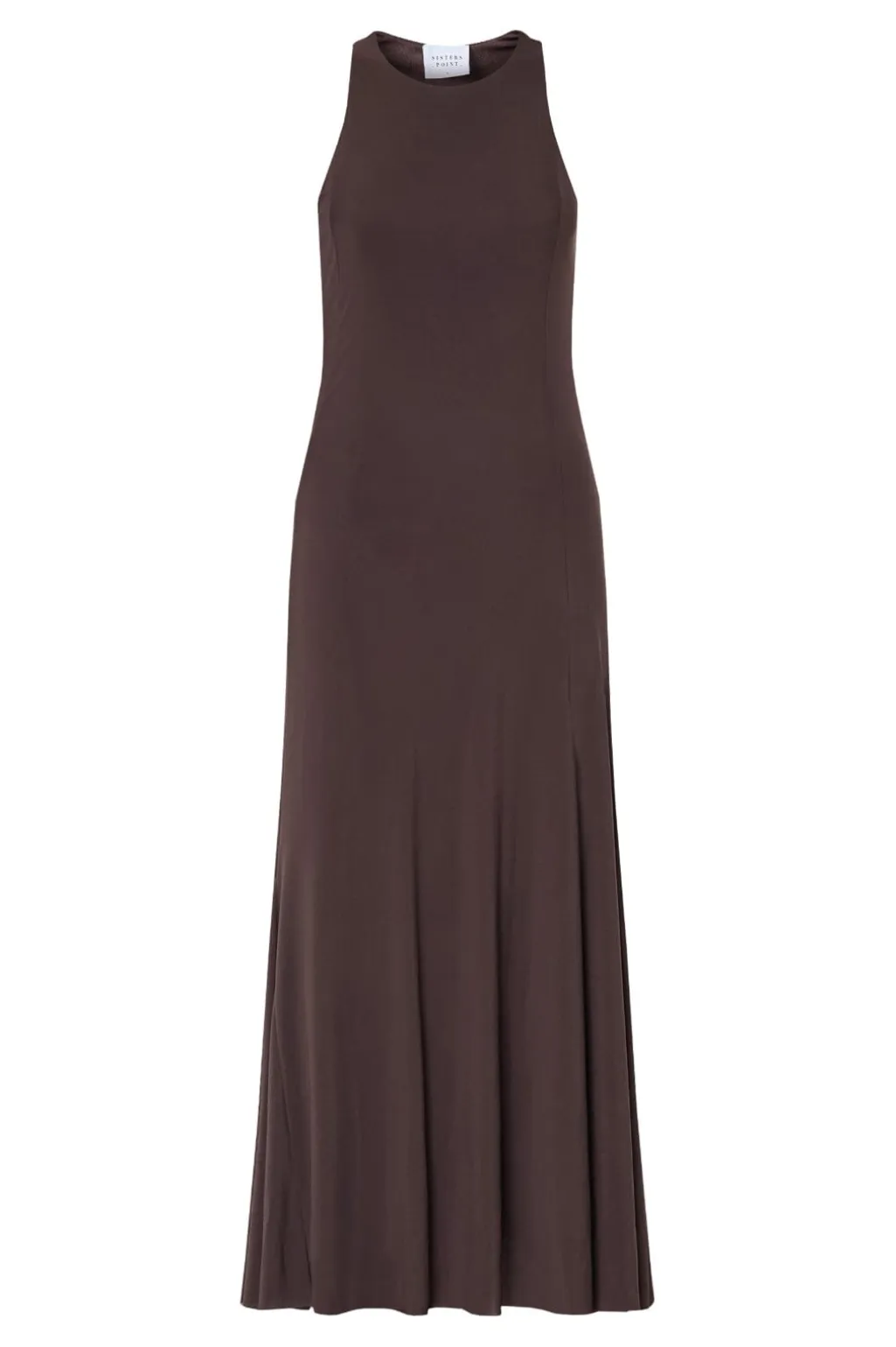 Lang brun kjole fra Sisters Point uden ærmer. Kjolen har en høj halsudskæring og en løs pasform forneden med slids i siden.
