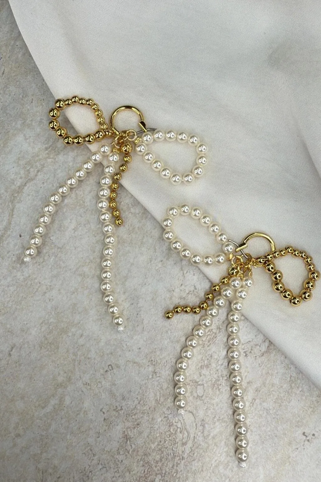 Øreringe fra Molly&My Jewellery i rustfrit stål med guldfarvet finish. Designet kombinerer guldfarvede perler med hvide og cremefarvede perlelignende perler i et hængende mønster.