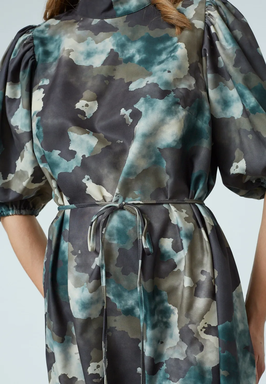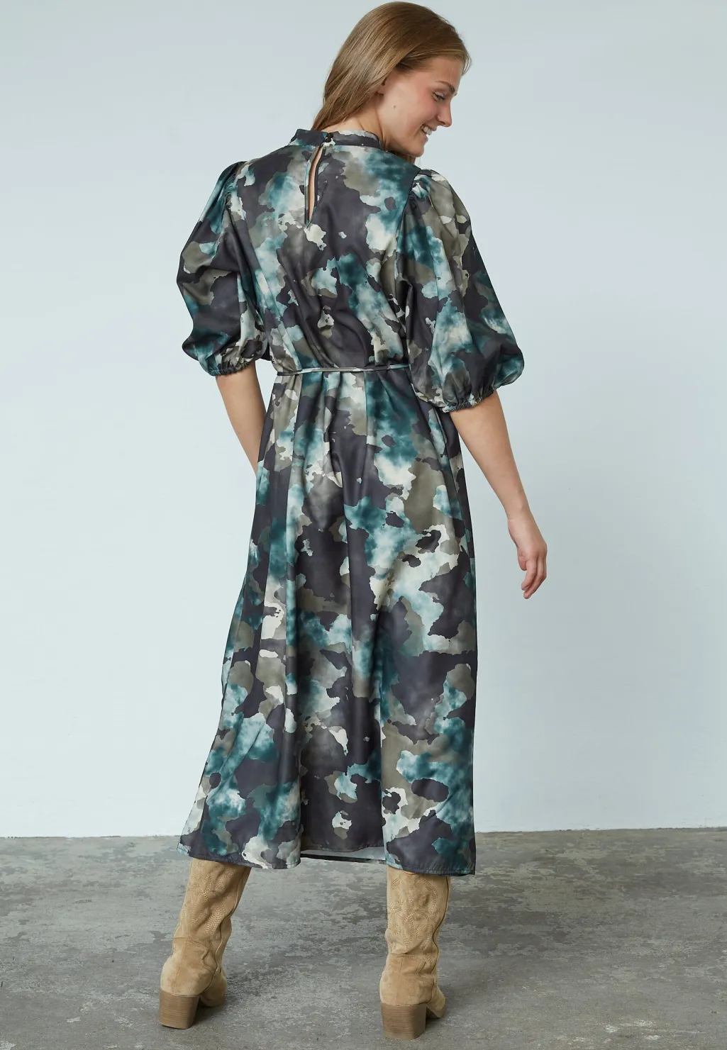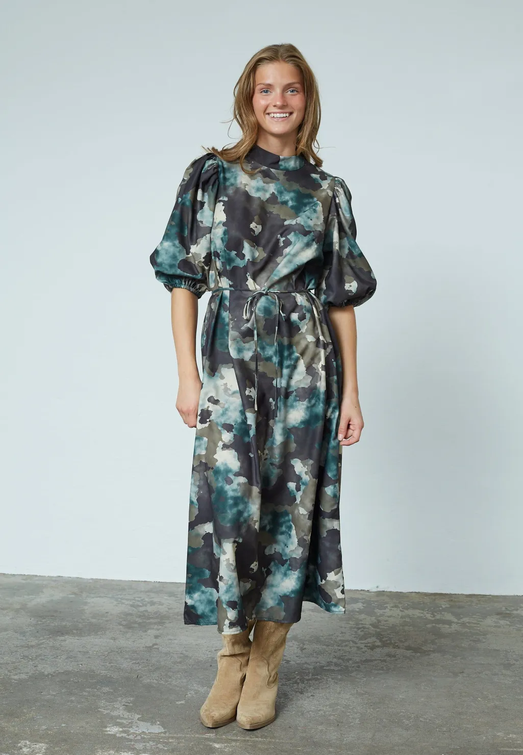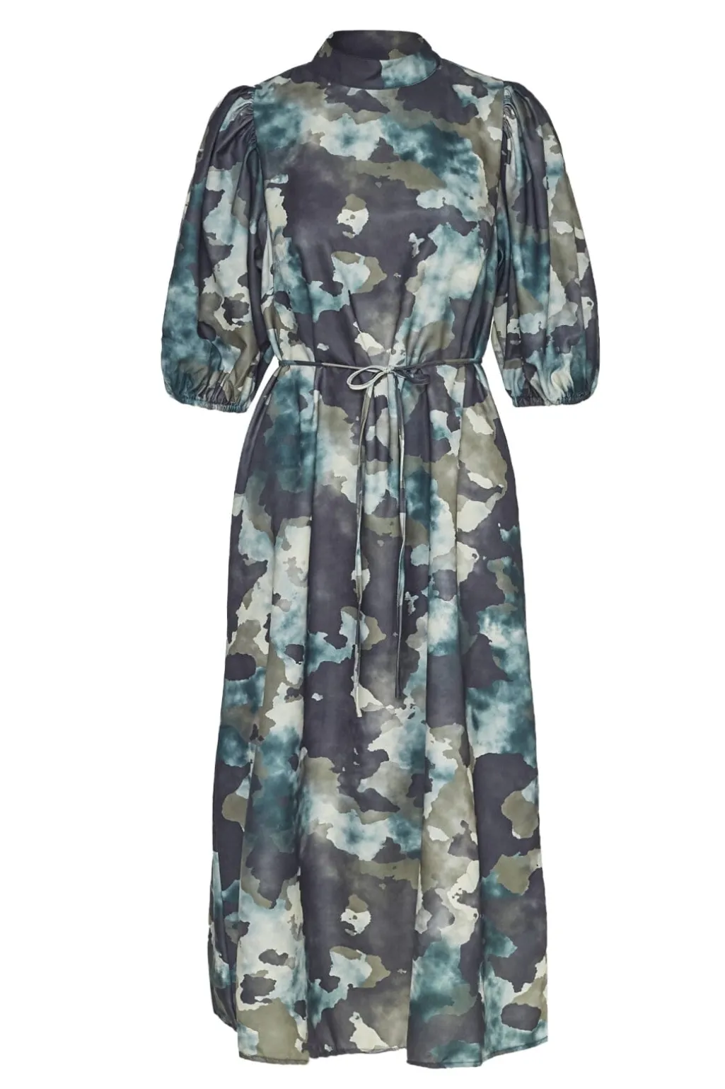 Kjole fra Sisters Point med camouflagemønster i blå, grå og beige nuancer. Kjolen har høj hals med pufærmer og bindebånd i taljen.