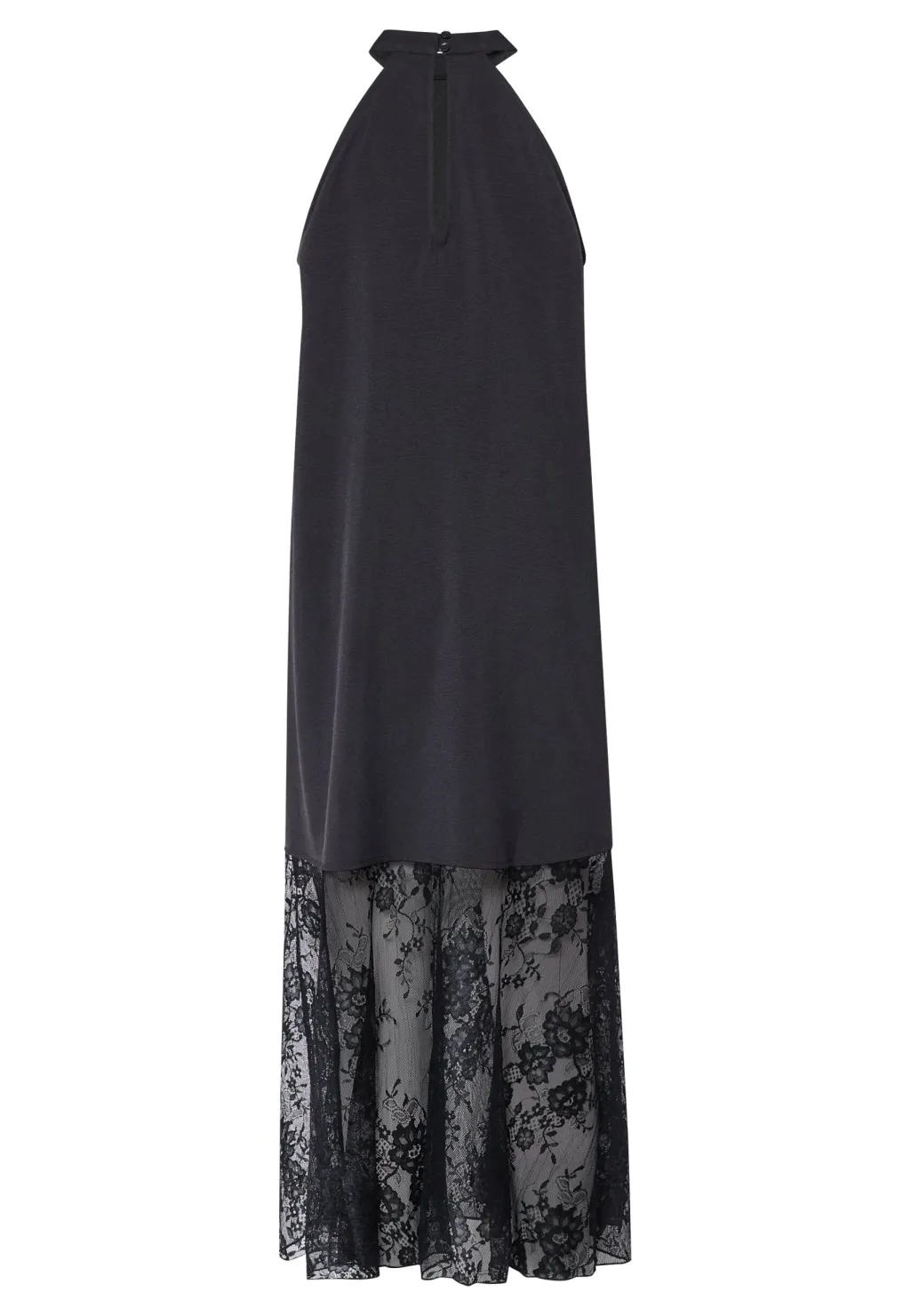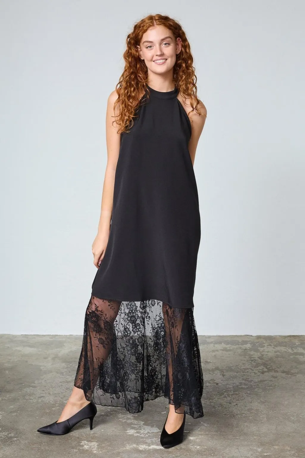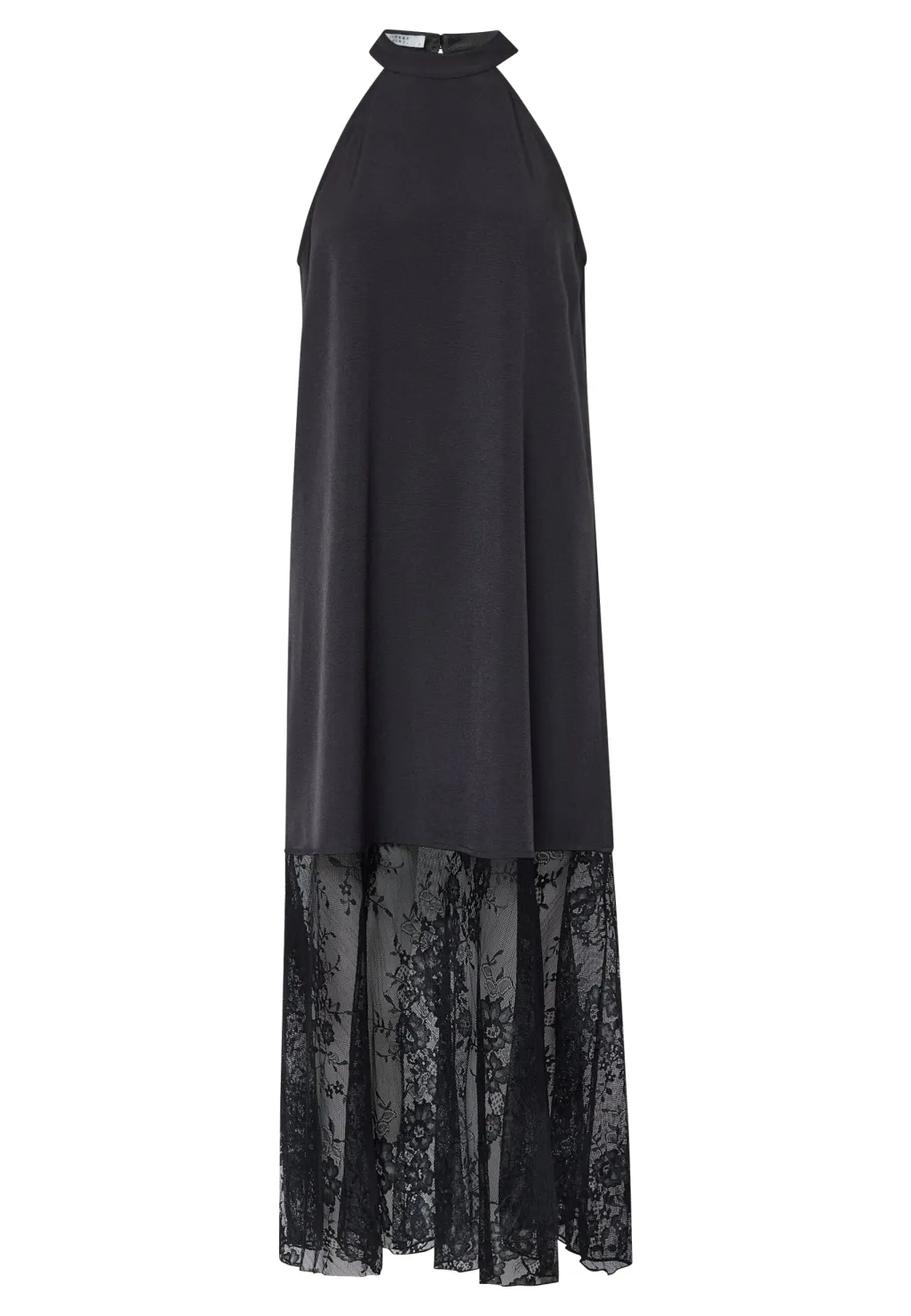 Sort ankellang kjole fra Sisters Point med høj halsudskæring. Den ærmeløse kjole har blonder i den nederste del og en løs pasform, der gør den velegnet til festlige anledninger.