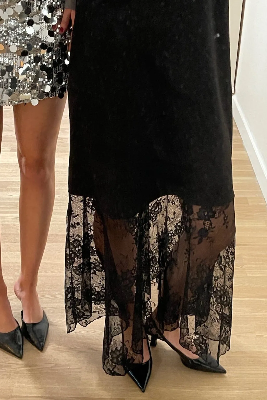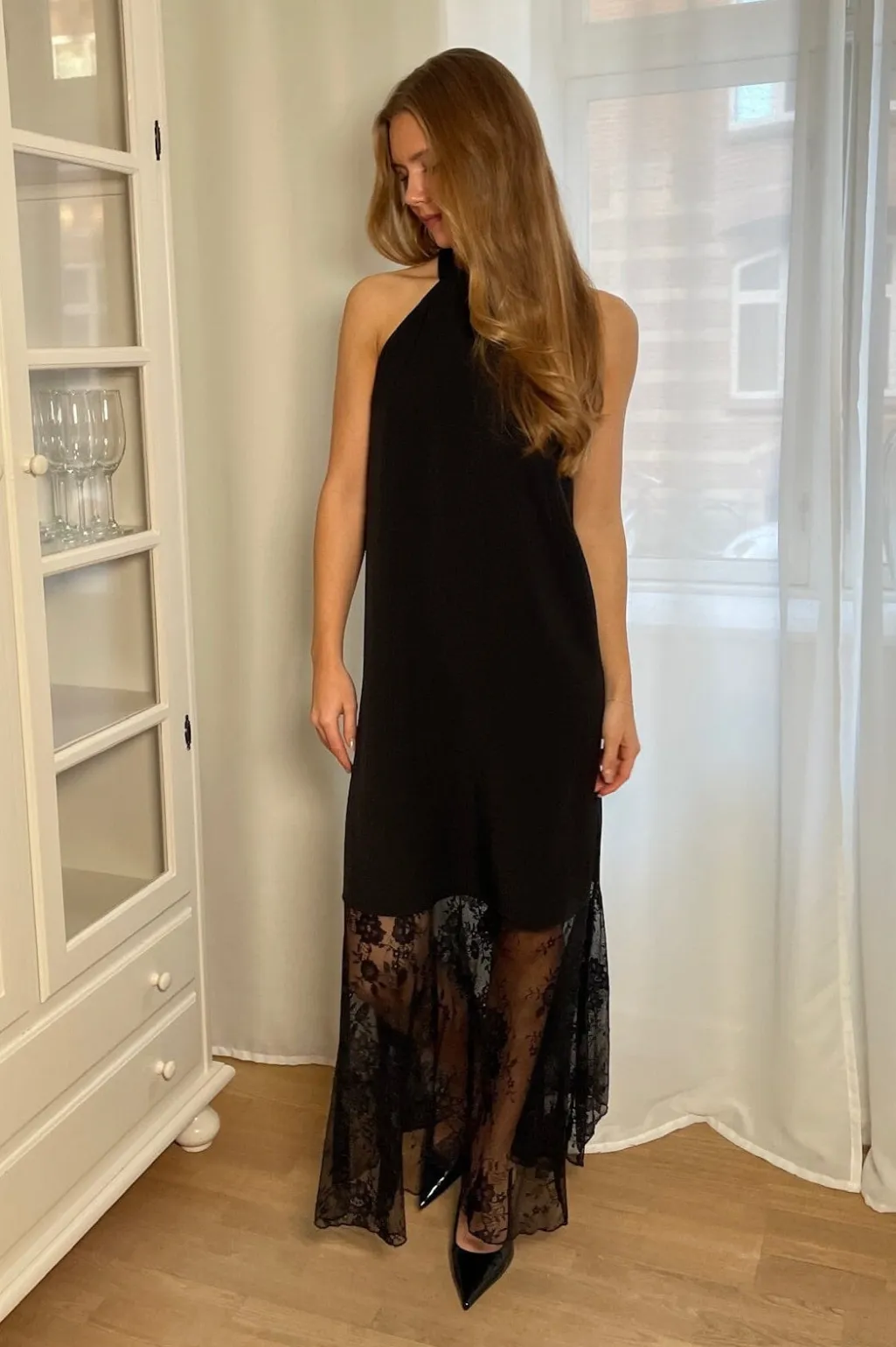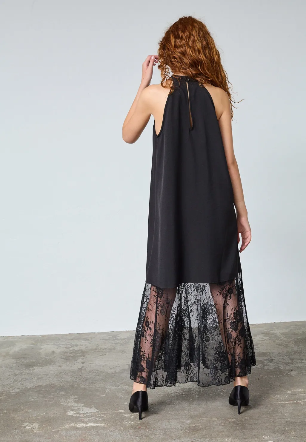 Sort ankellang kjole fra Sisters Point med høj halsudskæring. Den ærmeløse kjole har blonder i den nederste del og en løs pasform, der gør den velegnet til festlige anledninger.