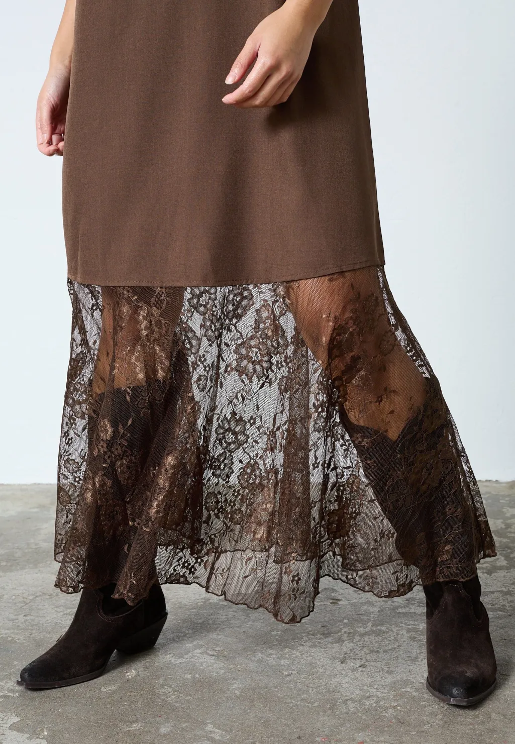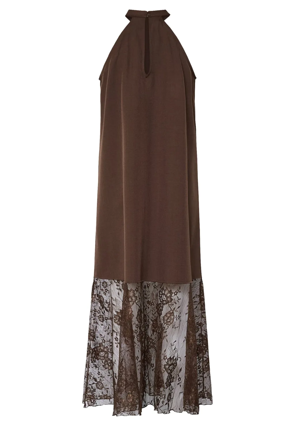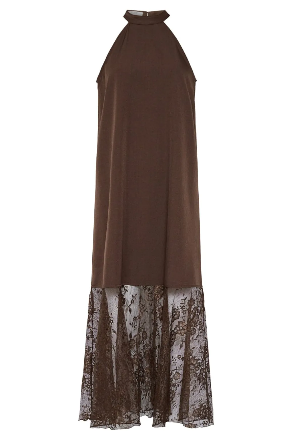 Brun kjole fra Sisters Point. Kjolen er ærmeløs med høj hals og går ned til anklerne. Nederste del har gennemsigtig blonde i et blomstermønster.