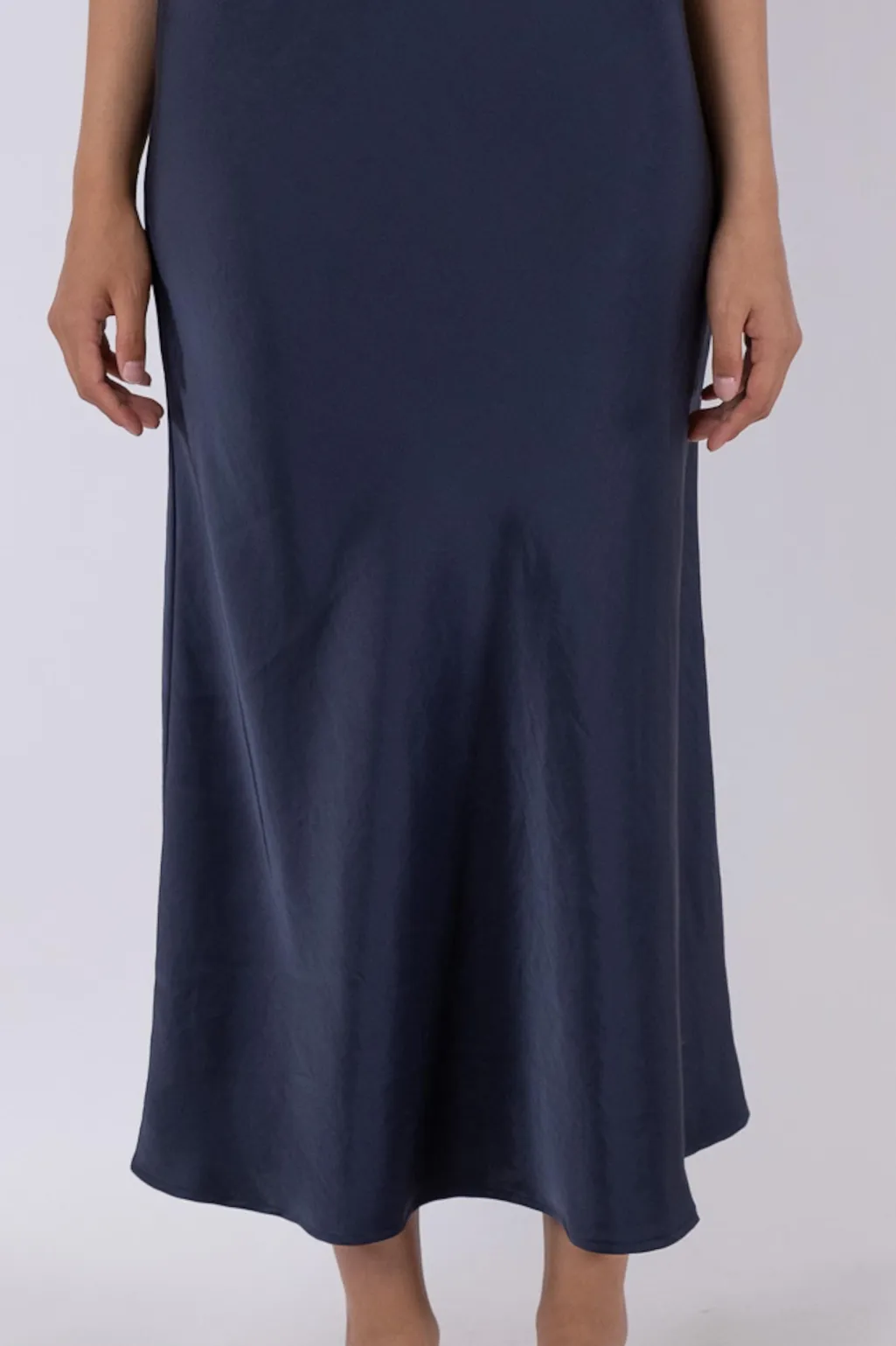 Mørkeblå nederdel i heavy sateen fra Neo Noir. Den skrå skæring og ankellængden giver nederdelen et rent snit og god bevægelighed.