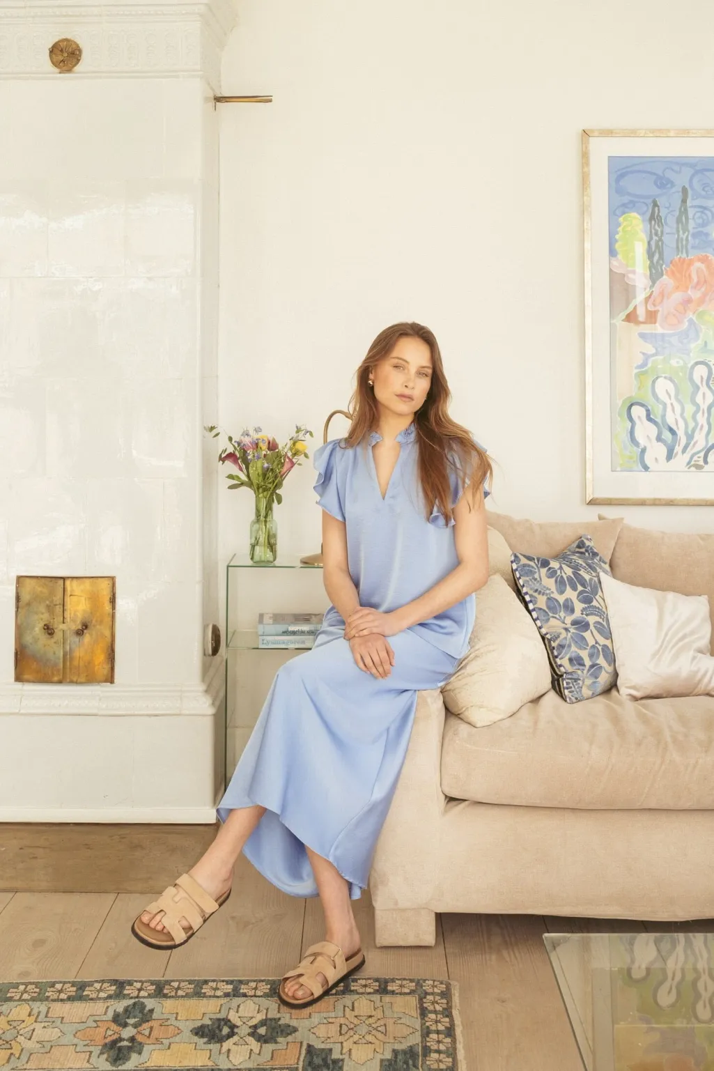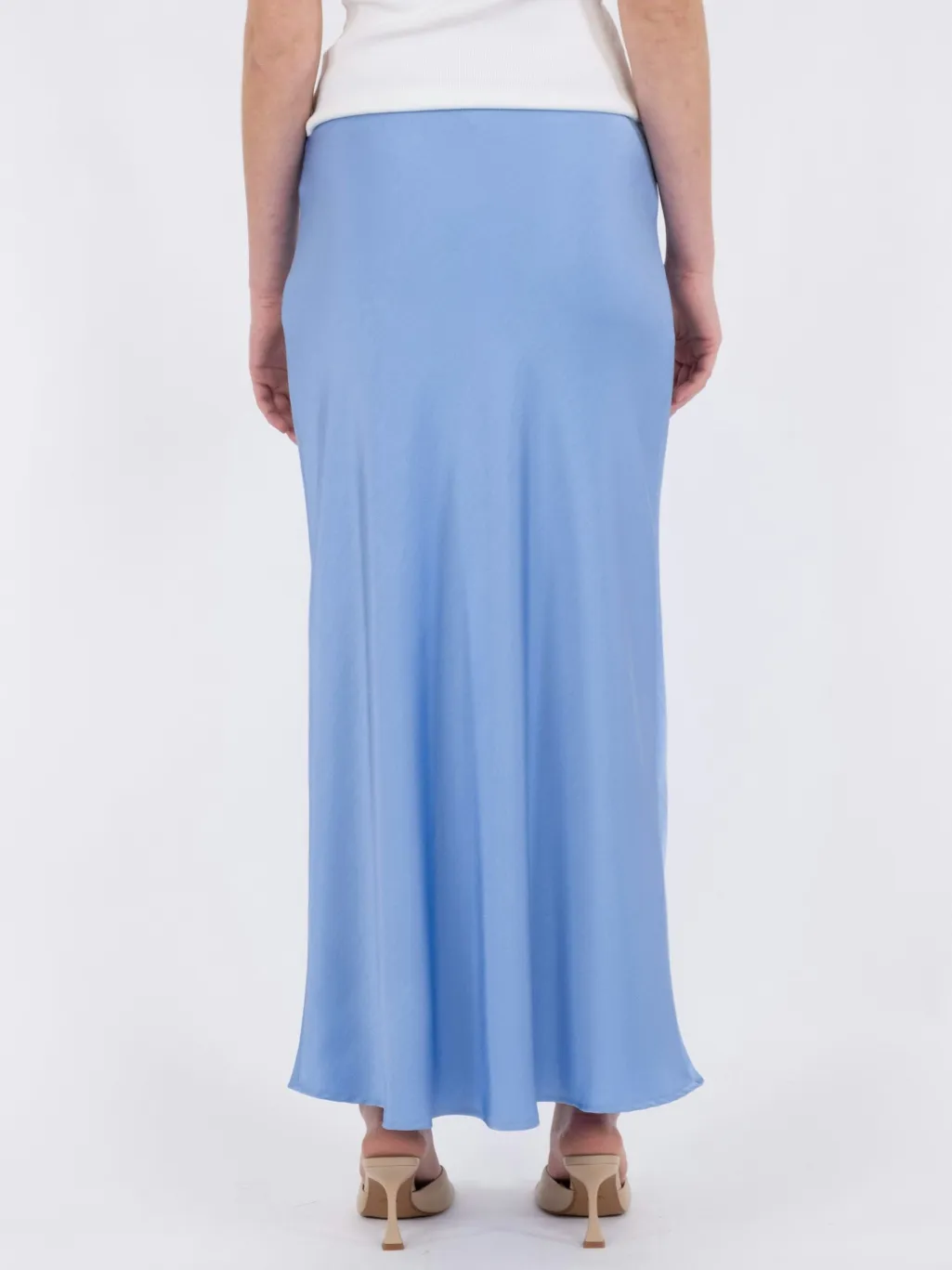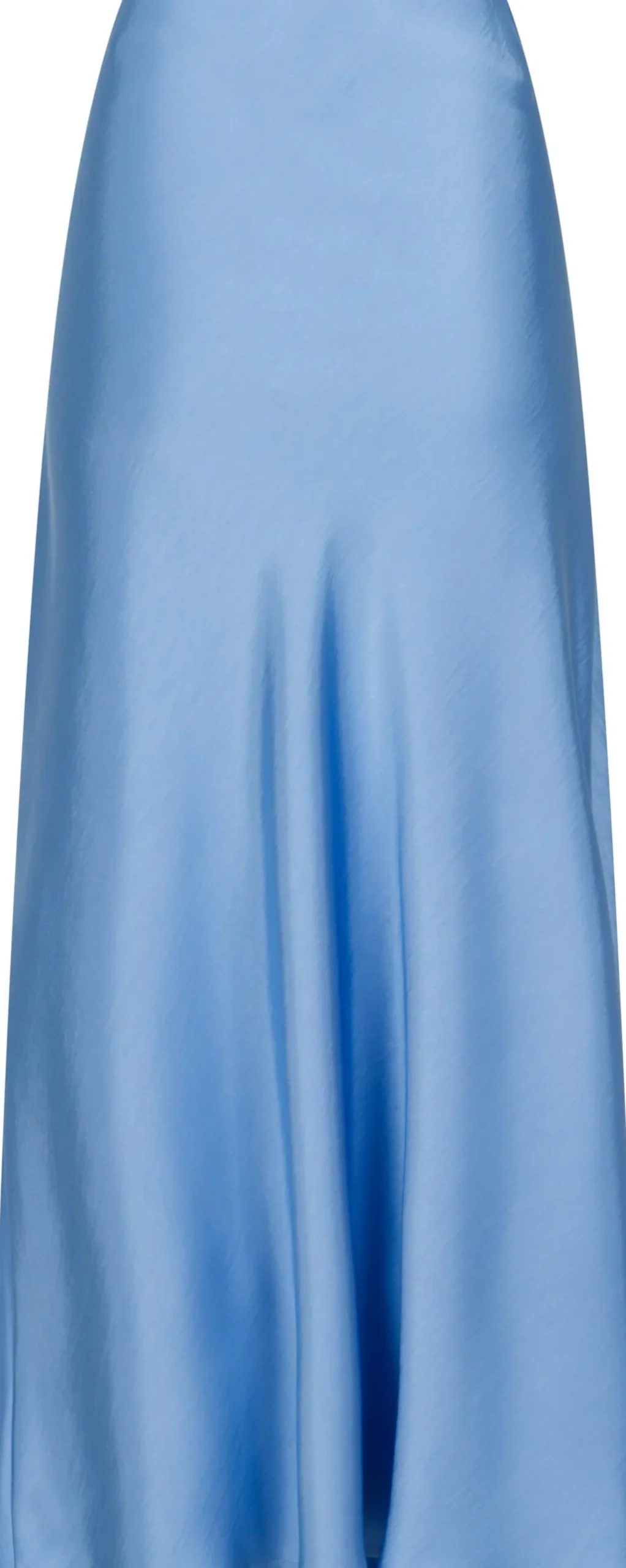 Lang nederdel i støvet blå satin med skrå skæring. Nederdelen har blød satinoverflade og indvendig elastik i taljen.