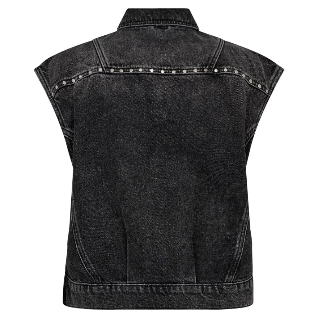 Sort denimvest fra Co´Couture, lavet af 100 % bomuld. Vesten har dekorative nitter langs lommerne og skuldrene, knaplukning med metalliske knapper og en klassisk skjortekrave.