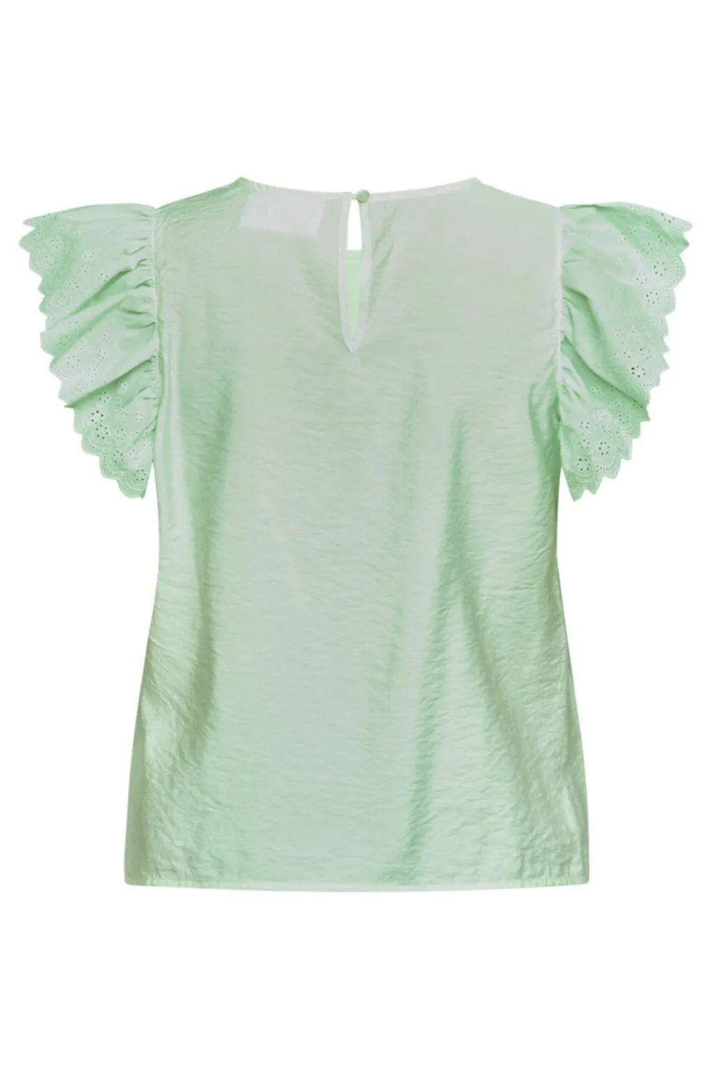 Mintgrøn top fra Sisters Point med flæser og broderi anglaise på ærmerne. Den runde hals og de korte ærmer giver en enkel grundform, mens flæserne tilføjer et fint detaljeniveau.