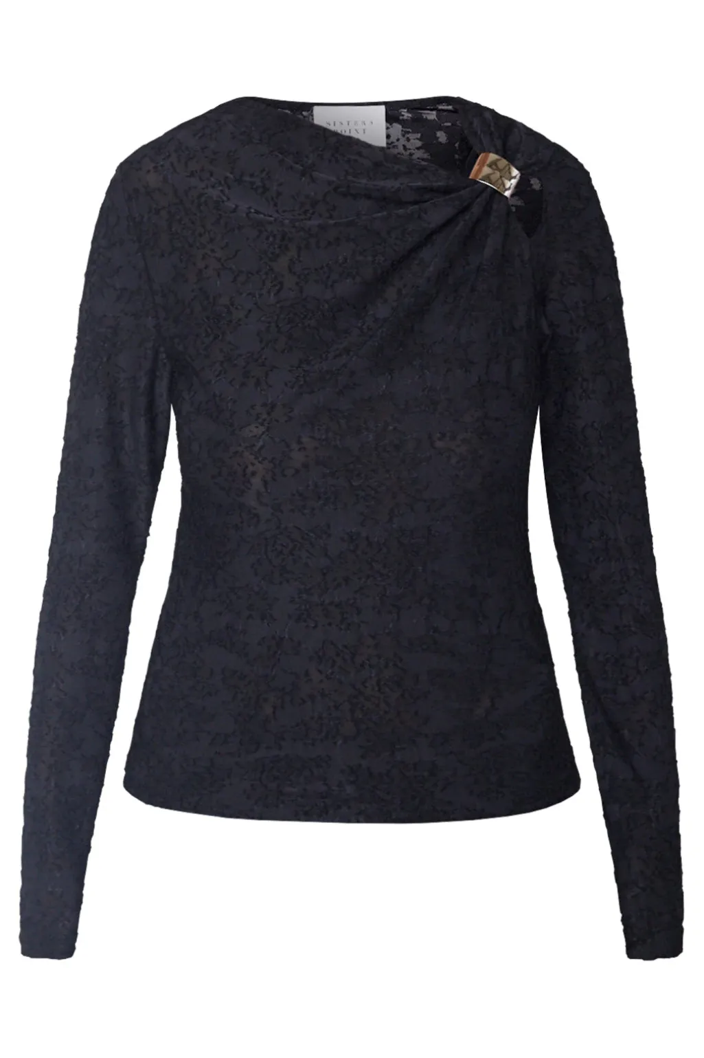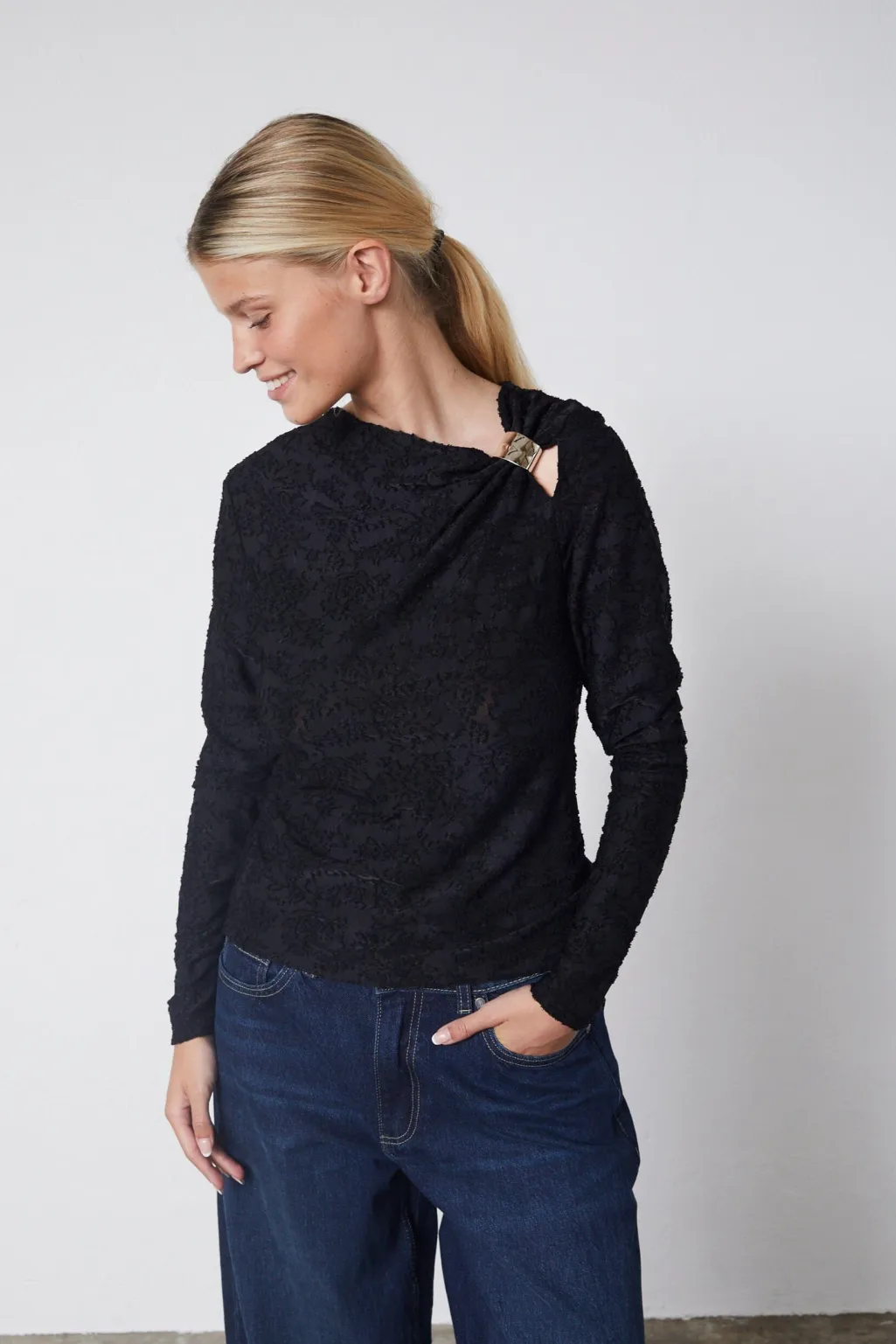 Sort langærmet top fra Sisters Point med et diskret mønster. Toppen har drapering og et dekorativt metalspænde ved halsen.