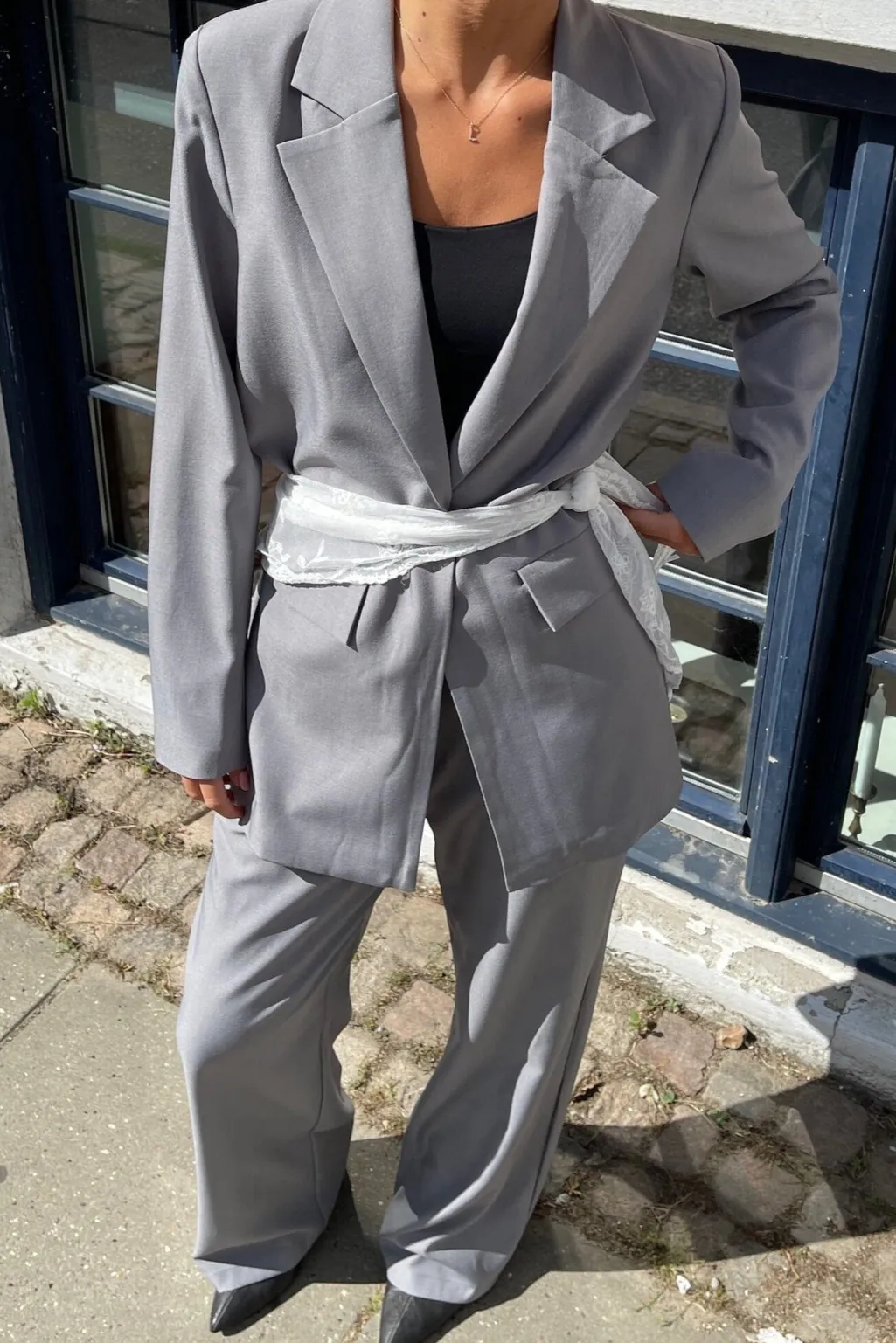 Grå blazer fra Sisters Point i en meleret grå nuance. Blazeren har reverskrave, knaplukning foran og to lommer med klap.