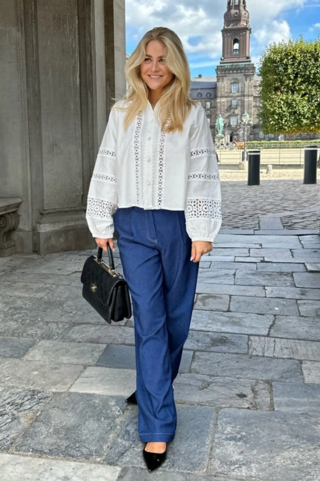 Hvid skjorte fra BYIC med blondedetaljer og broderi. De lange ærmer har ekstra volumen, og fronten har en klassisk knaplukning. Skjortekraven giver flere muligheder for styling.