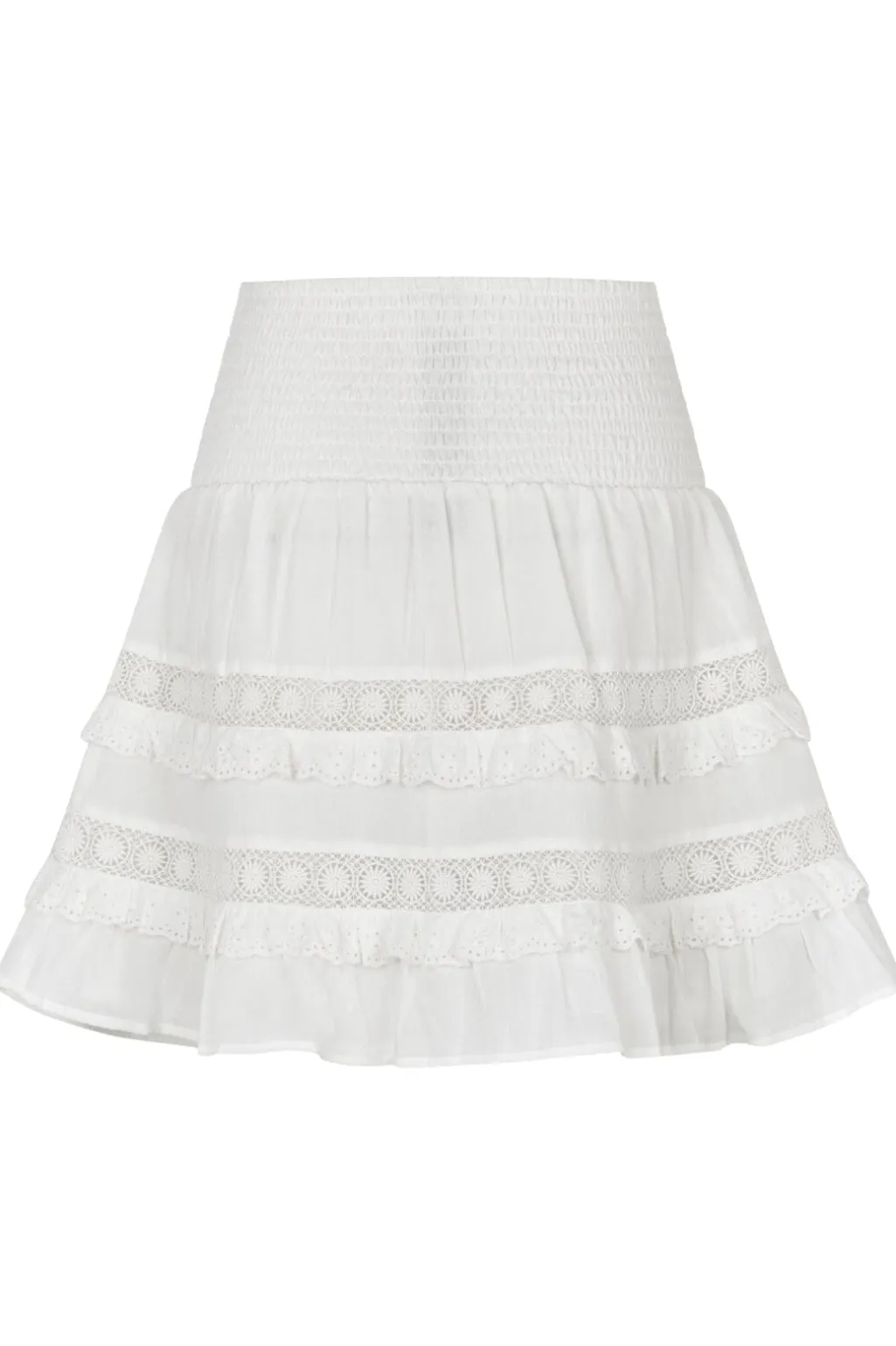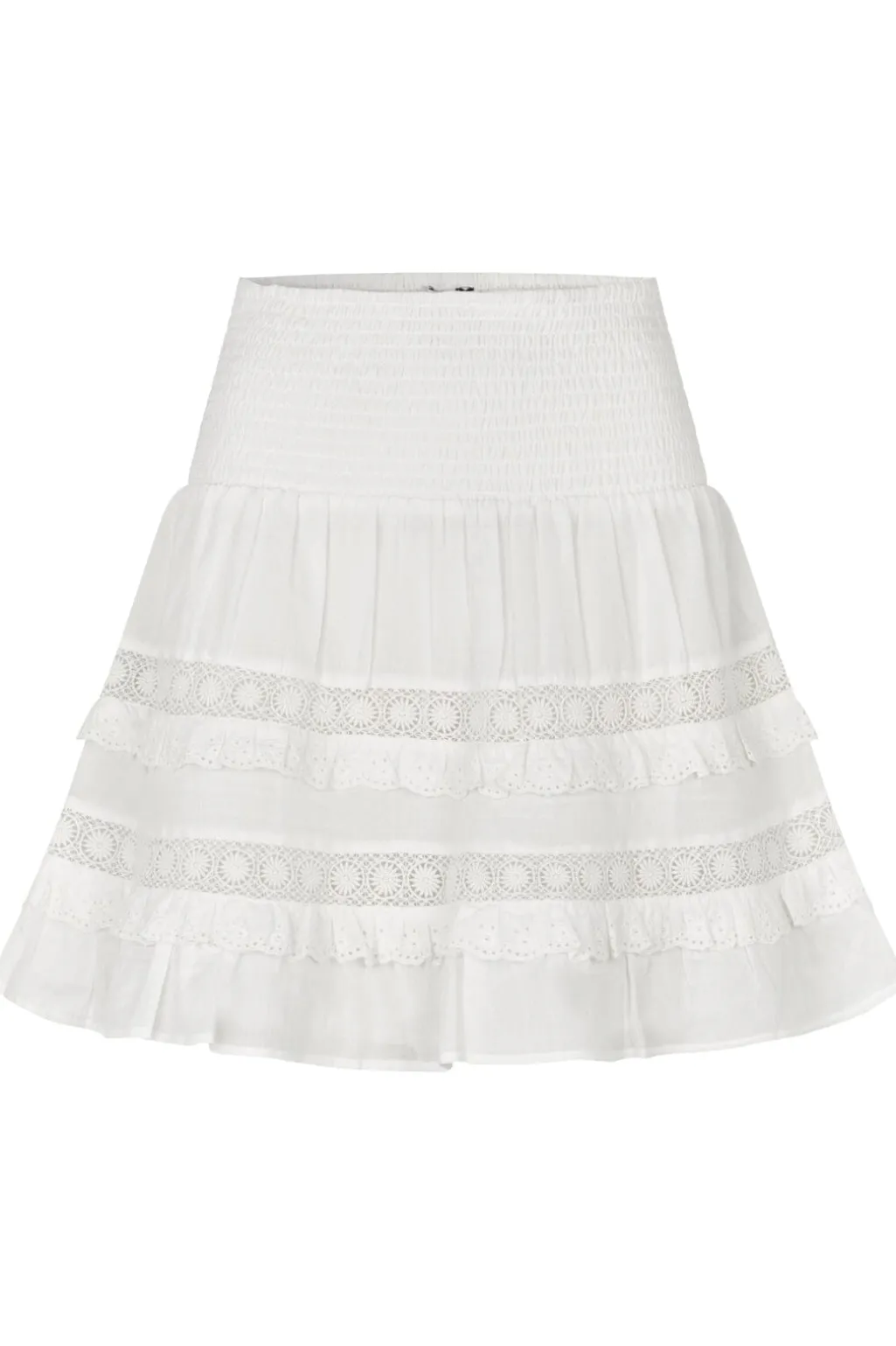 Hvid nederdel fra MbyM med høj talje og smock-detaljer. Nederdelen har lagdelte flæser og blondedetaljer, der skaber et feminint udtryk.