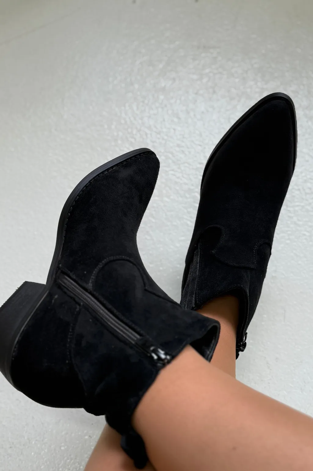 Sorte støvler fra Bloom med spids tå og blokhæle. Støvlerne passer til både festlige og afslappede lejligheder.