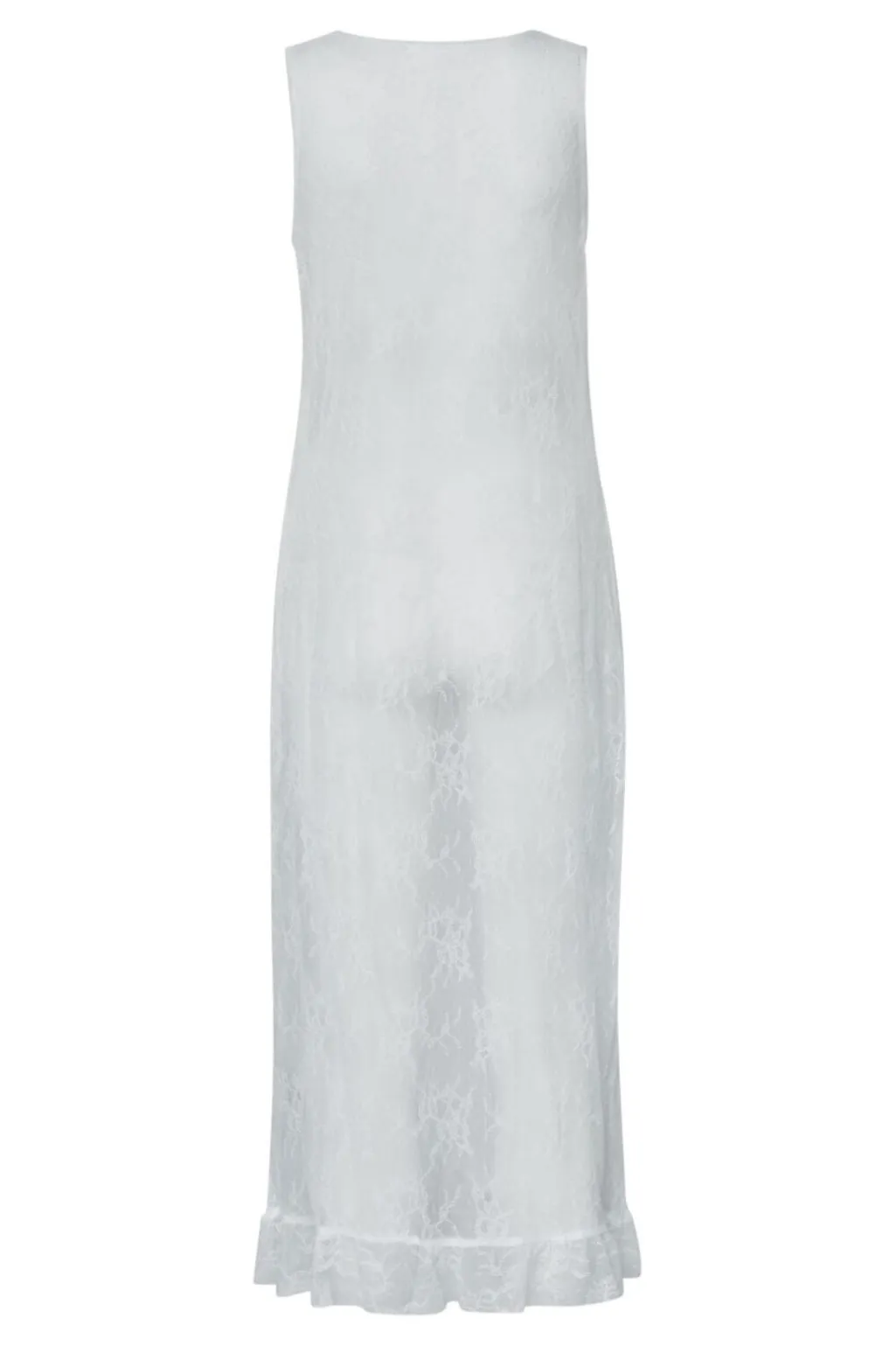 Hvid blondekjole fra Sisters Point med gennemsigtigt overlag og flæser. Den løse pasform og den asymmetriske kant giver kjolen et luftigt udtryk. Kjolen kan styles over et par jeans.