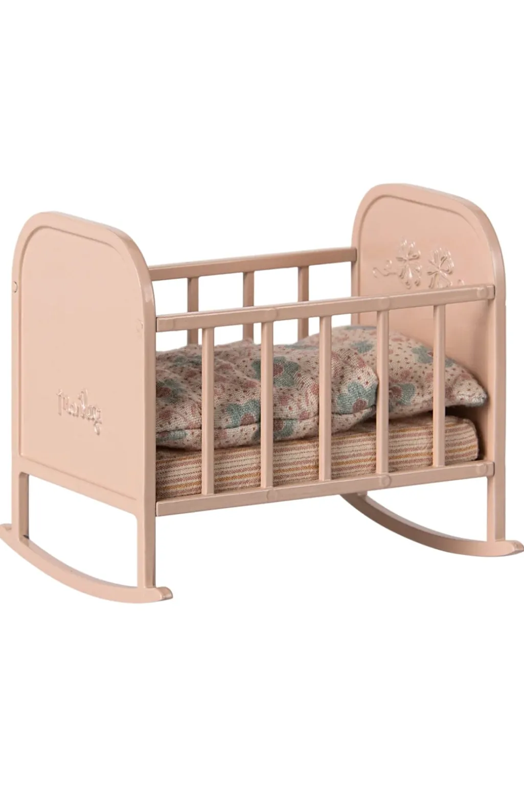 Lyserød vugge fra Maileg med afrundede ben og blomsterprægning på hovedgærdet. Vuggen har en mønstret madras og er designet til legetøjsmus.