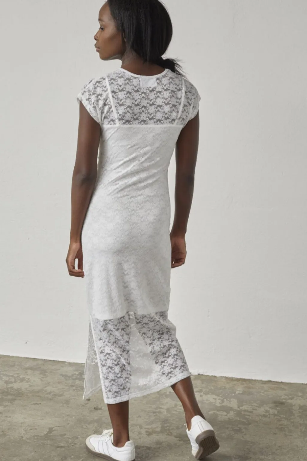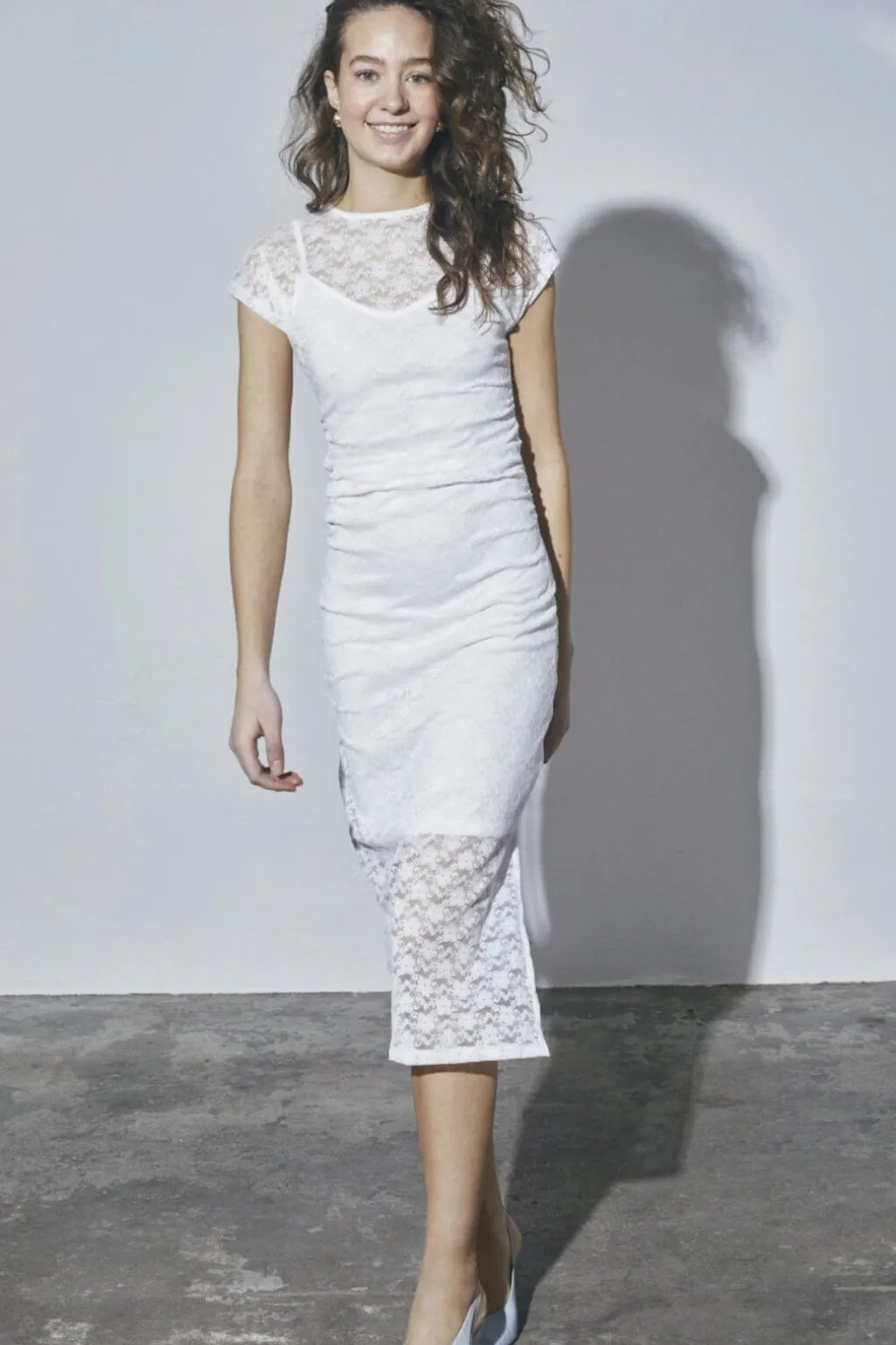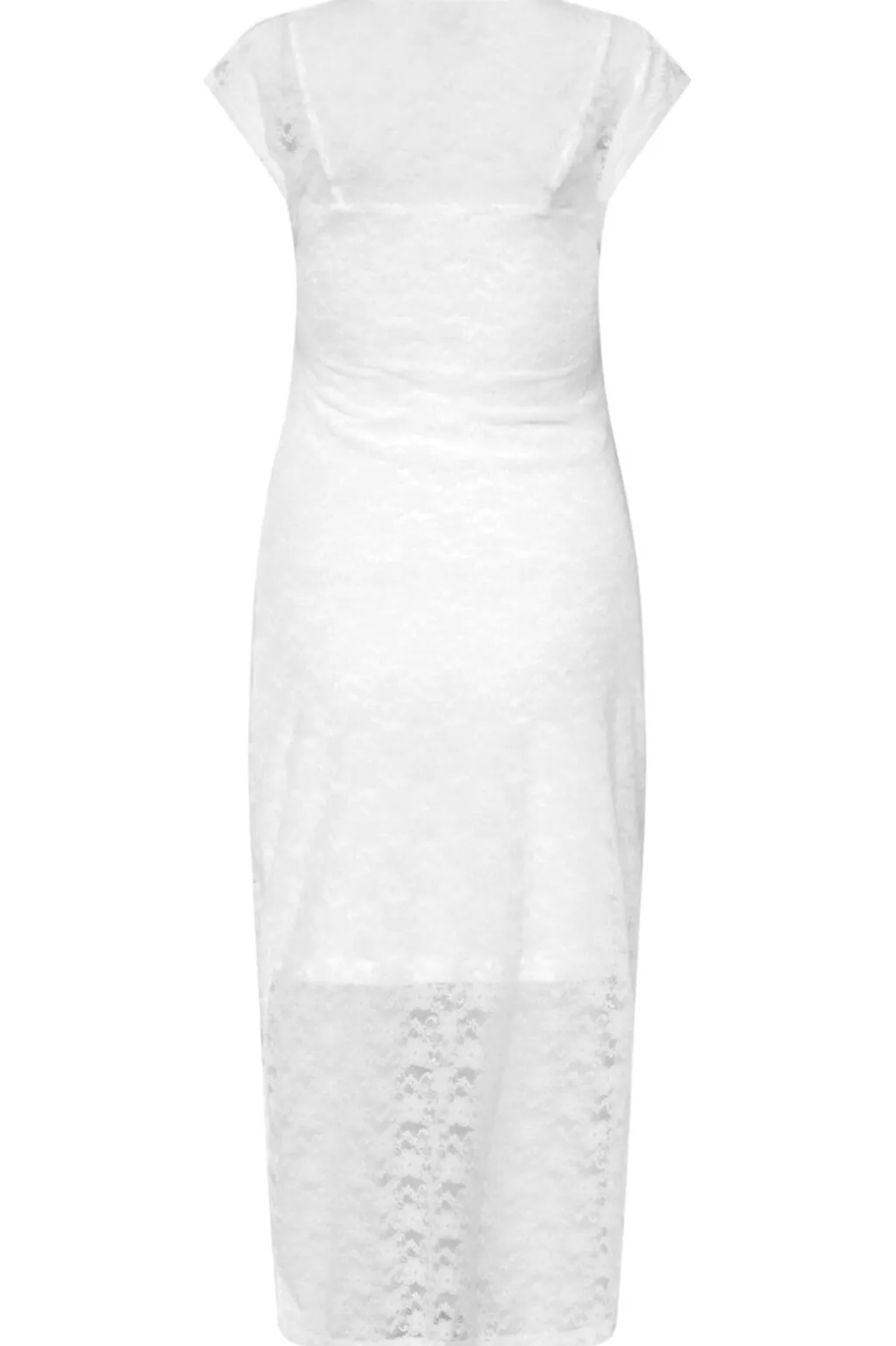 Hvid blondekjole fra Sisters Point med rund halsudskæring og korte ærmer. Kjolen har en tætsiddende pasform og kommer med en underkjole.