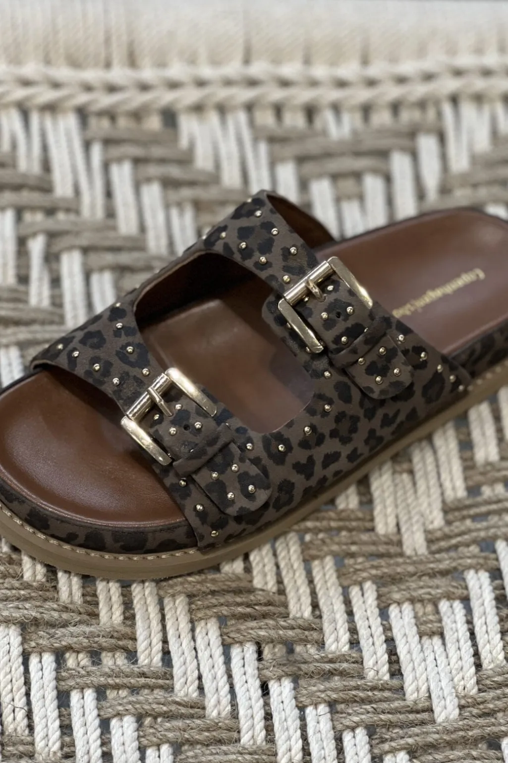 Sandal i ruskind med leopardprint og guldfarvede spænder. Den flade hæl og de justerbare remme gør sandalen praktisk til hverdagsbrug.