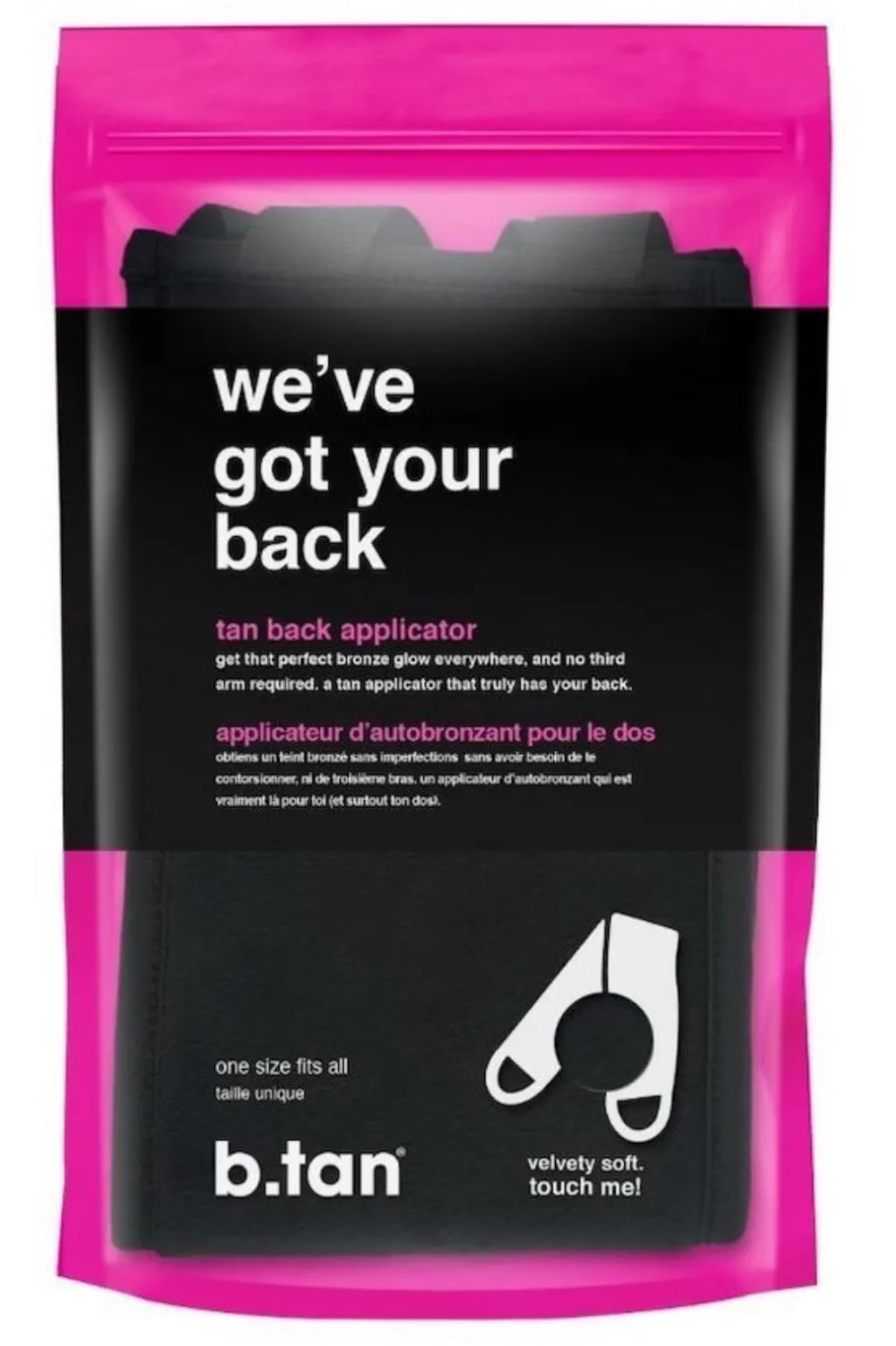 En påførringshandske til selvbruner med et specielt design til ryggen. Den gør det muligt at påføre selvbruner jævnt på ryggen uden hjælp fra andre.